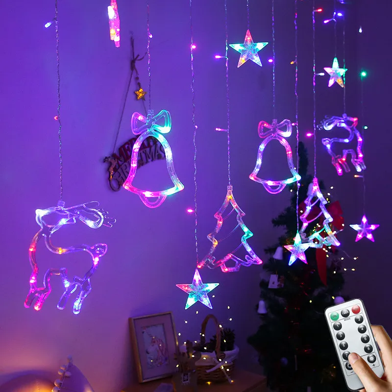 Рождественская гирлянда со светодиодными звездами, оленями, колокольчиками, 220 В, 110 В, Сказочная Гирлянда-занавеска для дома, украшение для нового года, свадьбы, вечеринки