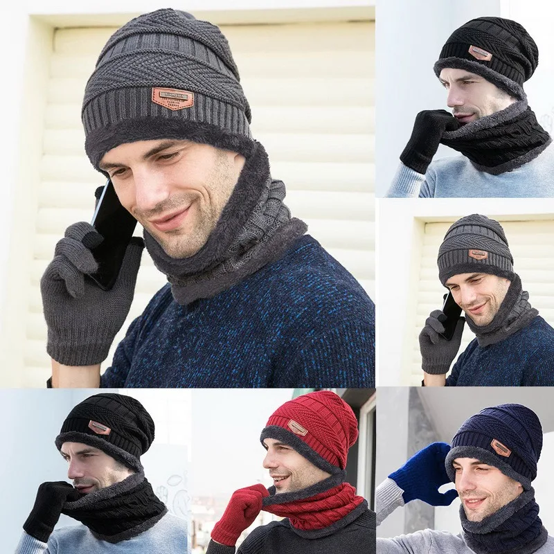 Мужской зимний вязаный комплект из шапки и шарфа и перчаток, женский теплый плюшевый комплект из 3 предметов, Мужская Уличная Лыжная Шапка и шарфы с кольцом, однотонный мужской комплект из 2021