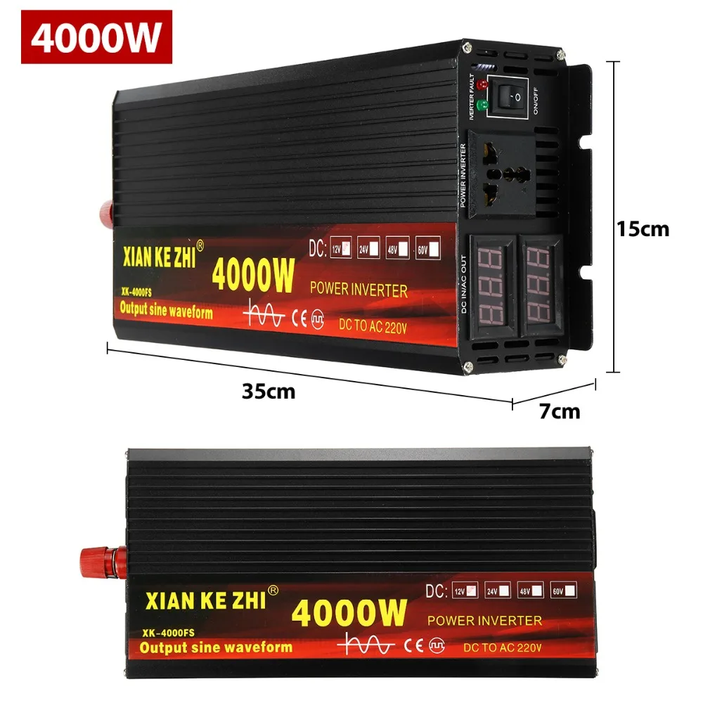 В комплект входит:1 x инвертор1 x Руководство пользователя1 х сверхтолстый кабель для батареи(1 х Толстая линия батареи 1 х аккумуляторная папка 2000 Вт)Характеристики:Тип: солнечный инверторФорма выходного напряжения: чистая Синусоидальная волнаМощность:2000 Вт/3000 Вт/4000 Вт/5000 ВтВыходное напряжение:220vВходное напряжение:12 ВВыходная частота: 50 ГцЗащита от низкого напряжения: 9,5 v / 20vВысокого давления защиты: 16v / 30vКоэффициент конверсии: 93% или болееРазмер: 29*12*7 см (2000 Вт) / 30*15*7 см (3000 Вт) / 35*15*7 см (4000 Вт)Особенности:-Двойной светодиодный цифровой дисплей-Алюминий-магниевого сплава, светильник вес, хорошая теплопроводность, может быстро понизить температуру комплектующих, офисный стиль, есть большие часов не влияет-Использование технологии чипа, высокая надежность, Сейсмическая стойкость, низкий уровень дефекта паяльного соединения, уменьшение помех батареи и радиочастоты-Восемь интеллектуальная защита, защита от перегрузки, защита от высокого напряжения, защита от низкого напряжения, защита от перегрева, защита от обратной полярности, защита от короткого замыкания, защита от перегрузки по току, Страховая защита-Чистая Синусоидальная волна, умный фильтр, отсутствие помех на электрическом, для защиты электроприборов-Коэффициент конверсии до 93%, уменьшение потери конверсии на 30%, увеличение непрерывной мощности на 30%-Высокоточная печатная плата-Встроенный интеллектуальный чип управления-Интеллектуальный вентилятор контроля температуры, делает инвертор более тихим. Когда температура ≤ 45 ℃, вентилятор перестает работать, когда температура ≥ 45 ℃, вентилятор начал работать-Устройство напоминания зуммера. Как только срабатывает Любая защита инвертора, инвертор немедленно отключает источник питания, а нагрузка входит в режим защиты и напоминает людям через звуковой сигнал-Винтовой терминал. Подключаемый штекер, легко заменить кабель-Двойные вентиляторы охлаждения для продления срока службы инвертора-Универсальное гнездо с тремя отверстиями, высокая совместимость, подходит для большинства приборов-Низкое энергопотребление в режиме ожидания, высокая скорость преобразования-Интеллектуальное управление чипом, полная защита