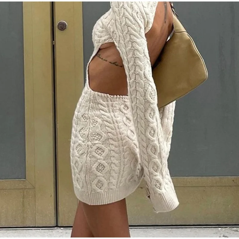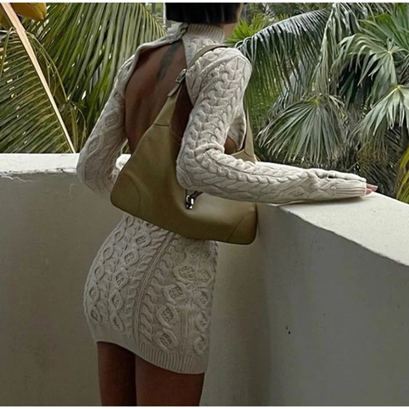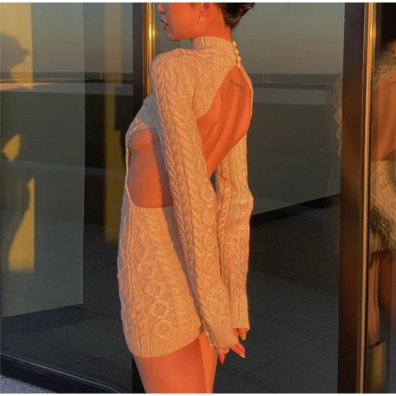 Женское трикотажное мини-платье с открытой спиной, демисезонное однотонное облегающее платье с вырезом и высоким воротником, 2021