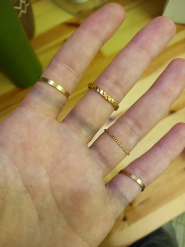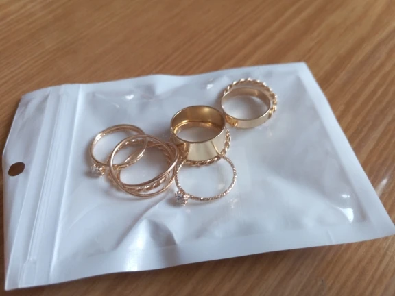 Заказано 11 ноября, прибыло в Пятерочку 25. Упаковано хорошо, купила за 28,45р. Возможно, поэтому положили одно бракованное кольцо. Носить его нельзя никак (2е кольцо на мизинце). Вмятины, шероховатости, пушырики, есть еще у пары колец, но у тех есть рабочие стороны. В принципе за такую цену все ок)