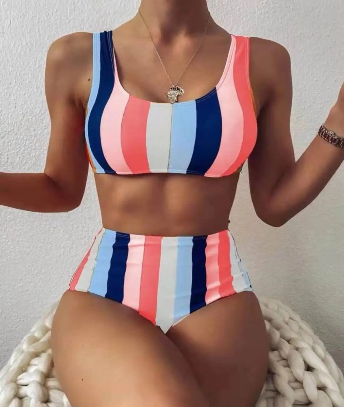 Новинка 2021, Элитный спортивный бюстгальтер в европейскую полоску с принтом, пикантный женский купальник, купальник с высокой талией, пляжный костюм