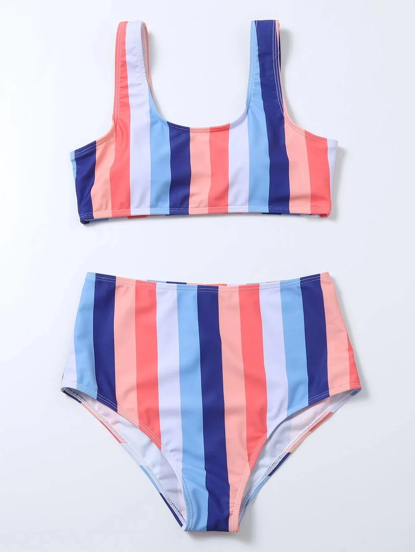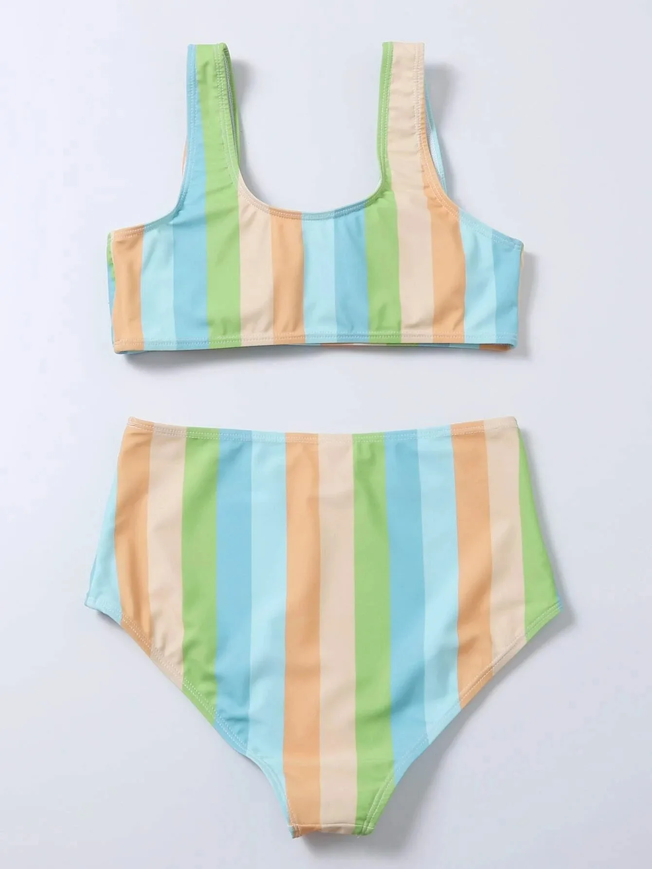 Летние полосатые бикини с высокой талией для девочек, бандажный ком...