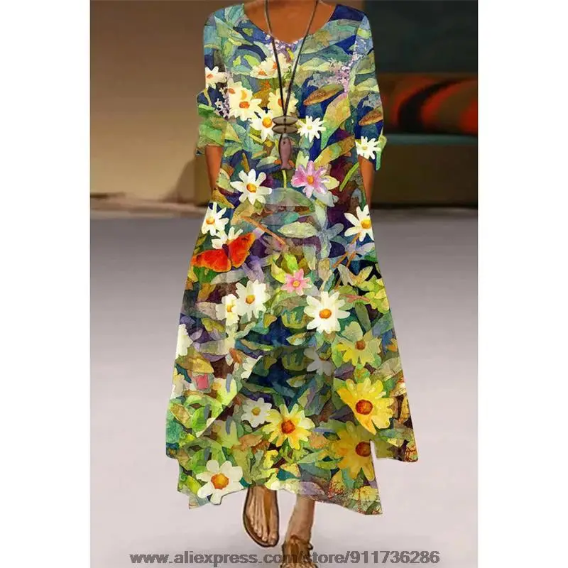Женское винтажное платье с 3D-принтом, длинное повседневное платье в стиле бохо, с цветочным принтом