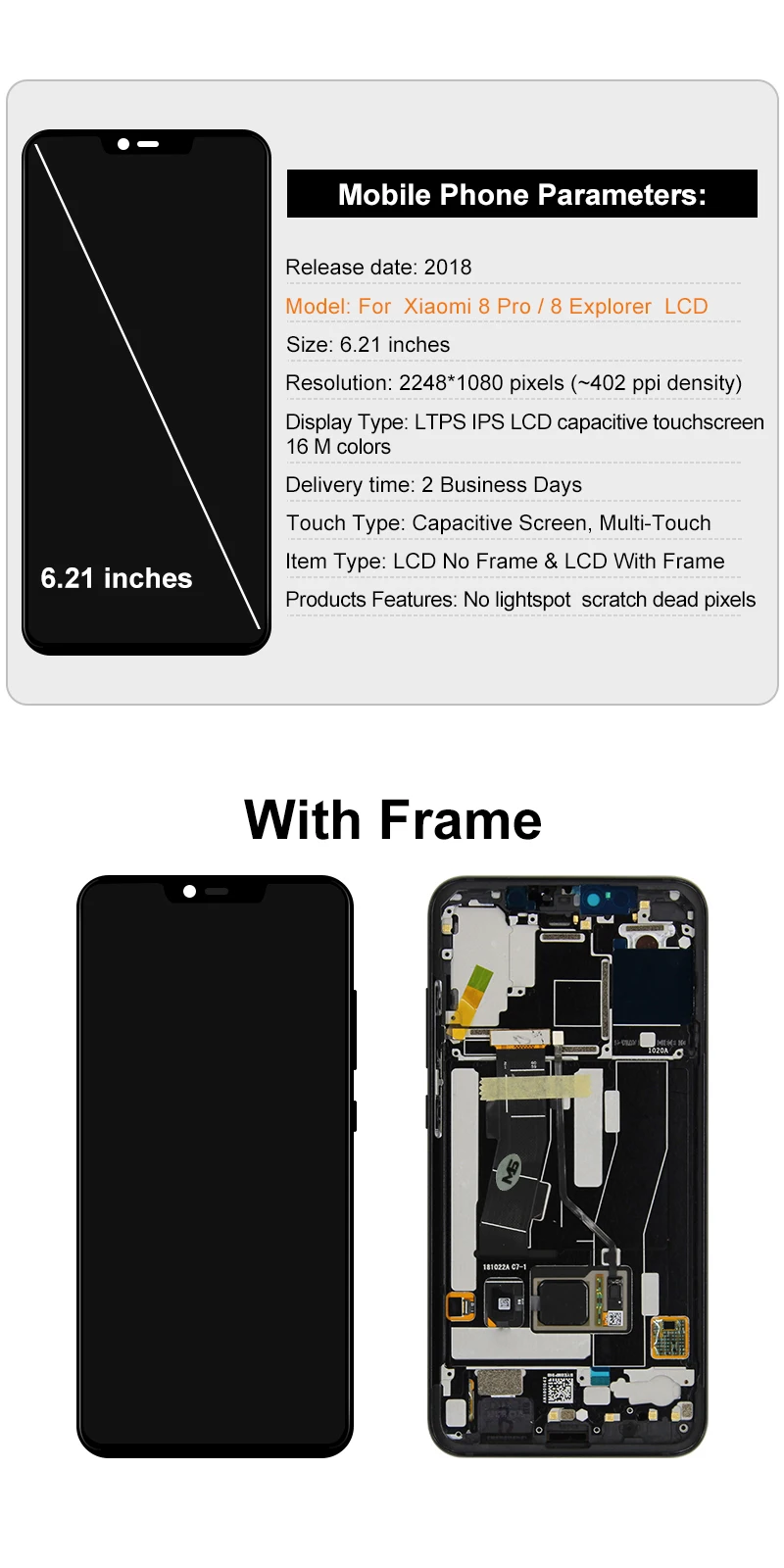 1. AMOLED качественный ЖК-экран в сборе дляXiaomi Mi8 Pro Mi 8 Explorer(Пожалуйста, выберите правильный вариант в соответствии с вашими потребностями. Спасибо)