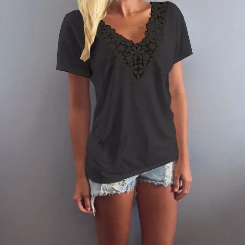 Женская кружевная блузка с V-образным вырезом, с коротким рукавом