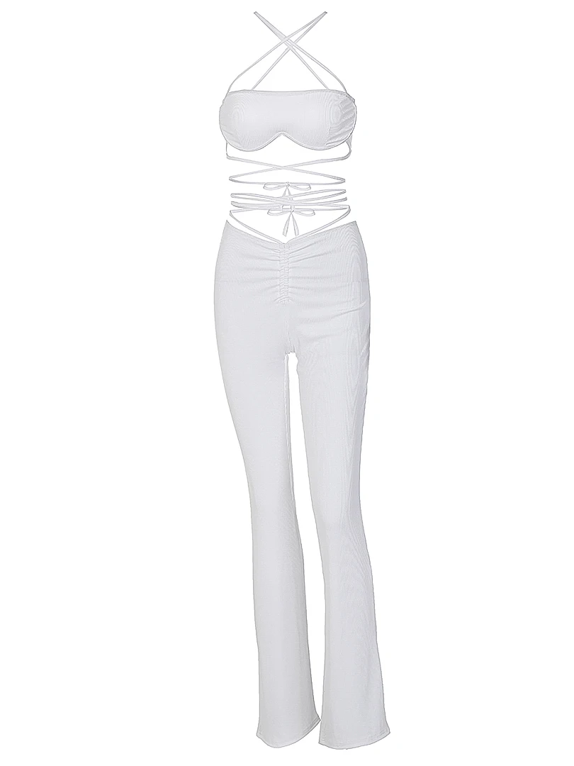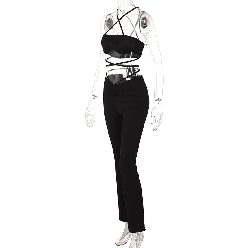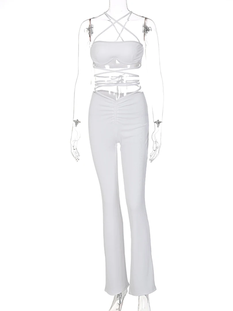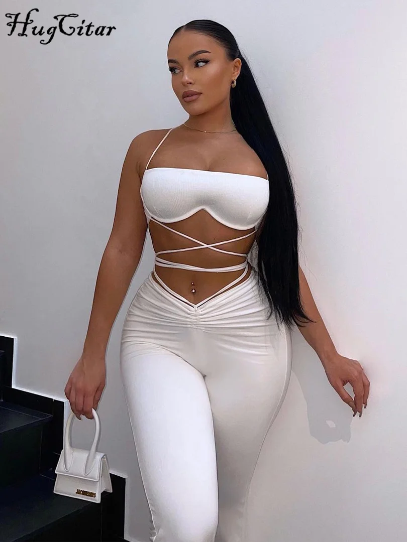 Hugcitar Однотонный женский бандаж без рукавов с бретельками, Укороченный бюстгальтер с рюшами, леггинсы с высокой талией, комплект из 2 предметов, осень 2021, уличная одежда Y2K