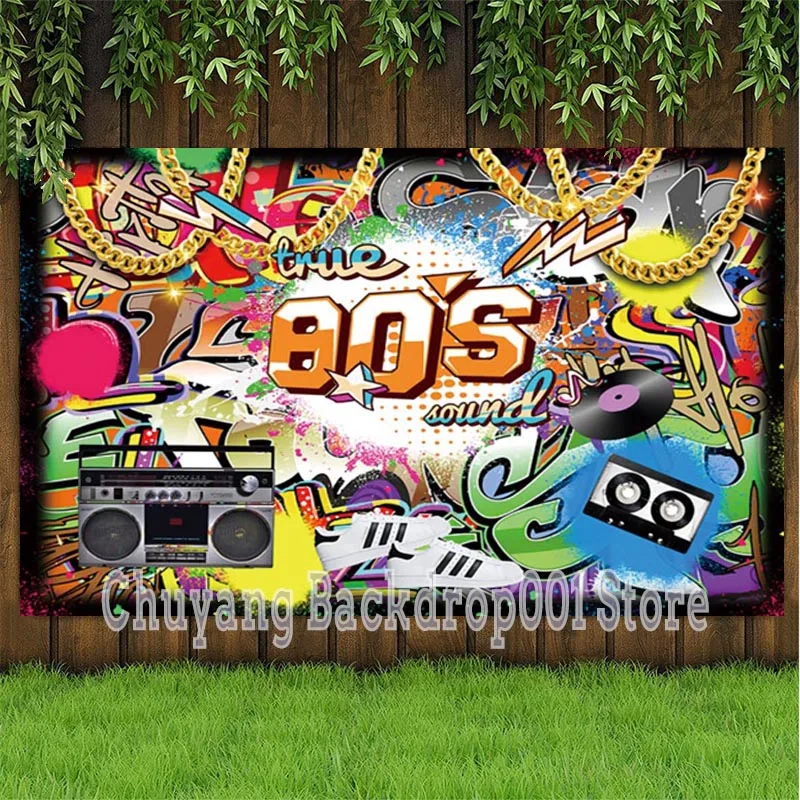 Фон для фотографирования в стиле хип-хоп в стиле 80-х годов с изображением музыкальных граффити и световой сцены