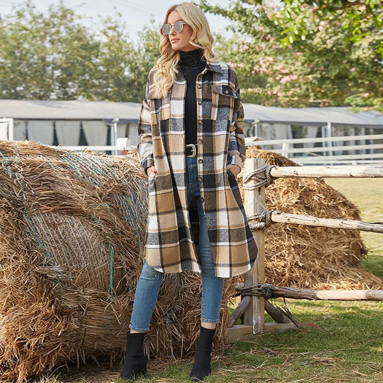Женская Повседневная клетчатая рубашка из смески шерсти, Свободное пальто с пуговицами