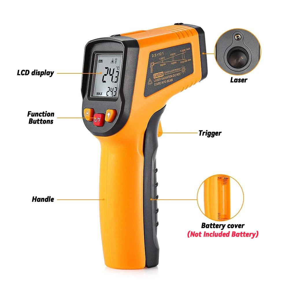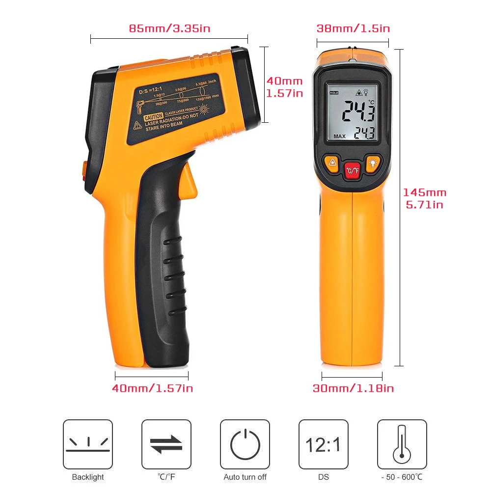 Особенности:• Лазерная указка для точного прицеливания• Простое управление одной рукой• ЖК-дисплей со спинкой светильник• Переключатель включения/выключения лазера• Индикация низкого заряда батареи• Светодиодный светильник для работы при плохом освещении• Преобразование температурного блока C /F• Автоматическое выключение в течение 7 секунд без каких-либо действий• Удержание дисплея, функция сканирования Характеристики:• Диапазон измерения: -50 °C ~ 380 °C ( -58 °F ~ 716 °F)• Точность: -50 °C ~ 0 °C (± 3 °C), 0 °C ~ 716 °C (± 1.5%)• Повторяемость: 1 °C или 1% чтения• Разрешение: 0,1 °C или 0,1 °F• Время отклика: 500 мс, 95% ответ• Излучение: 0,95 Предустановленный• Расстояние до точки рациона: 12:1• Спектральная Характеристика: 8 ~ 14 мкм• Температура хранения: -20 °C ~ 60 °C (-4 °F ~ 140 °F)• Рабочая температура: 0 °C ~ 40 °C (32 °F ~ 104 °F)• Рабочая влажность: 10-95% относительной влажности без конденсации, до 30 °C (86 °F)• 2 х ААА 1,5 V батарея (не входит в комплект)