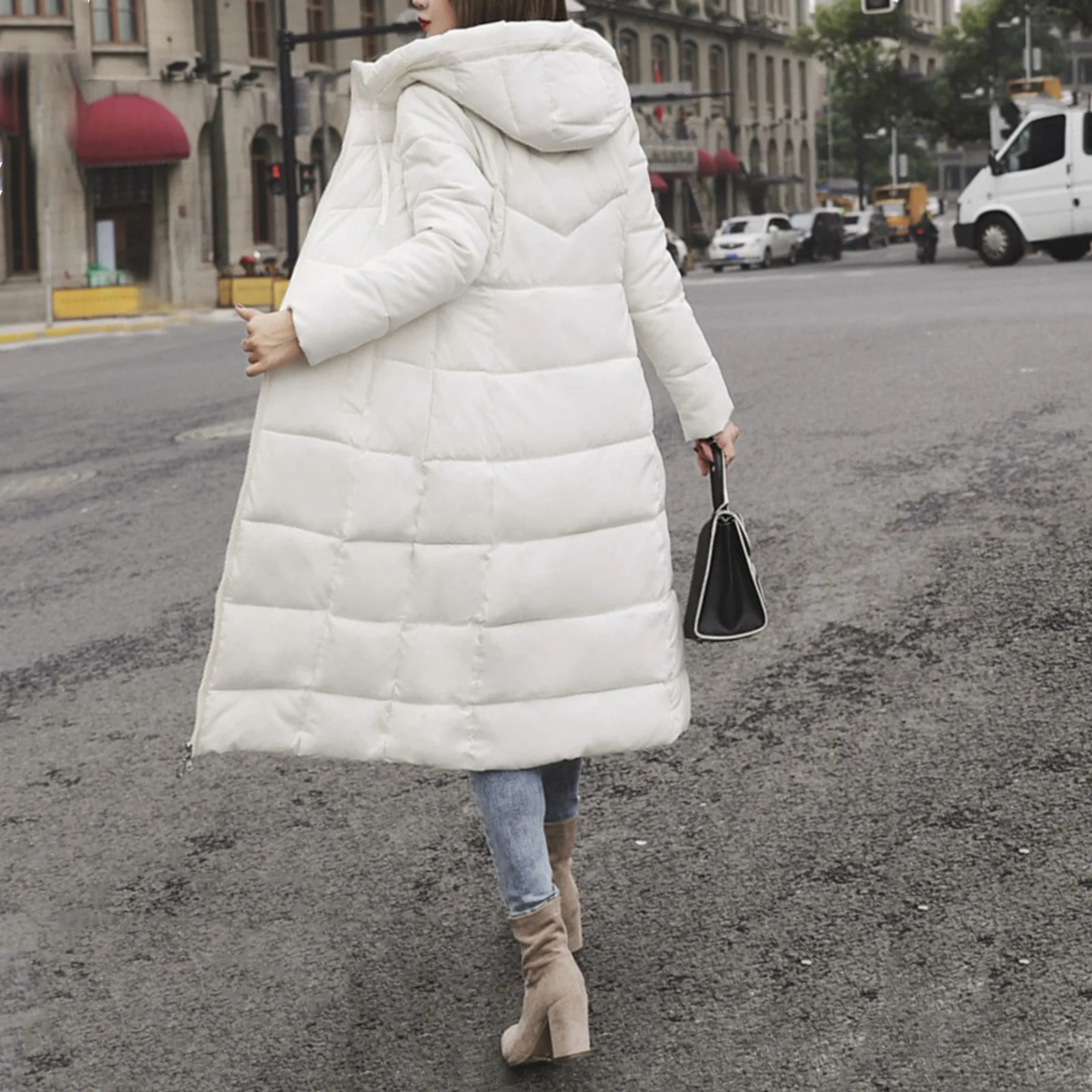 Зимние женские свободные утепленные пуховики, однотонные длинные стеганые куртки на молнии с карманами и капюшоном, ульсветильник кие тонкие длинные куртки