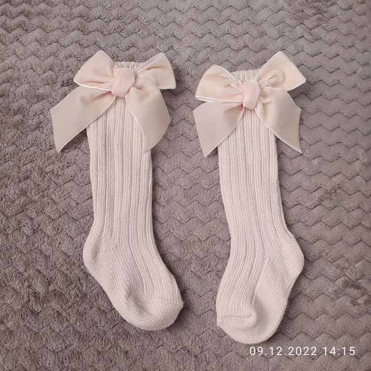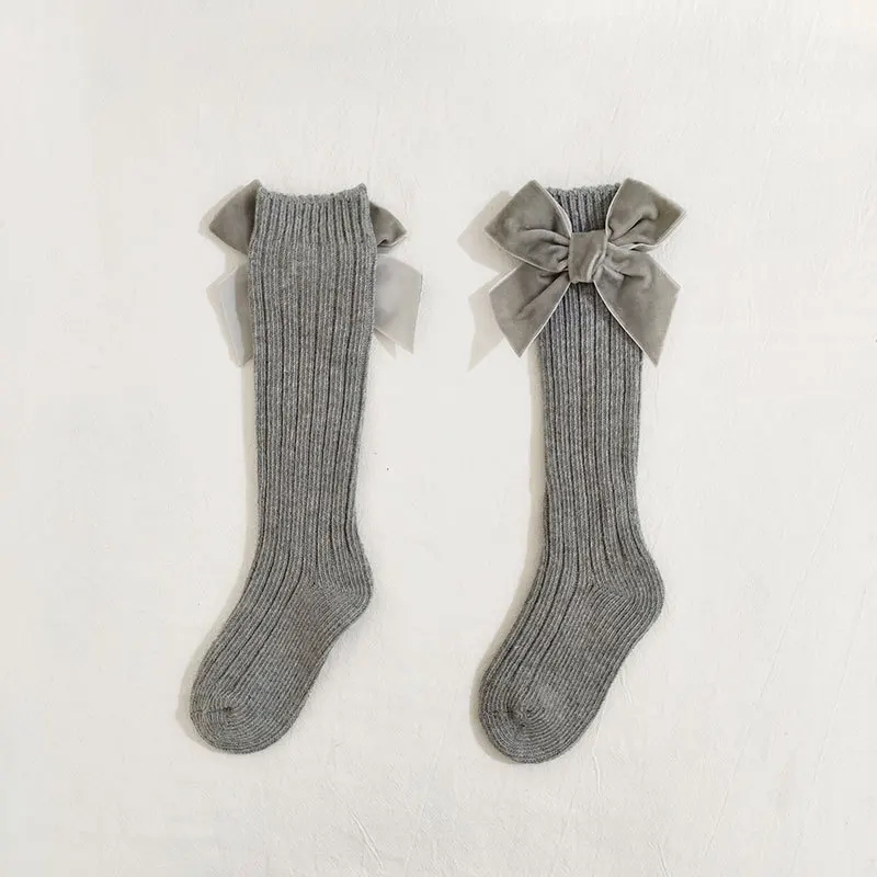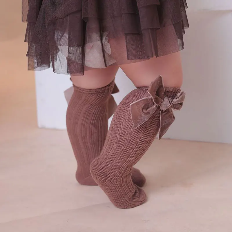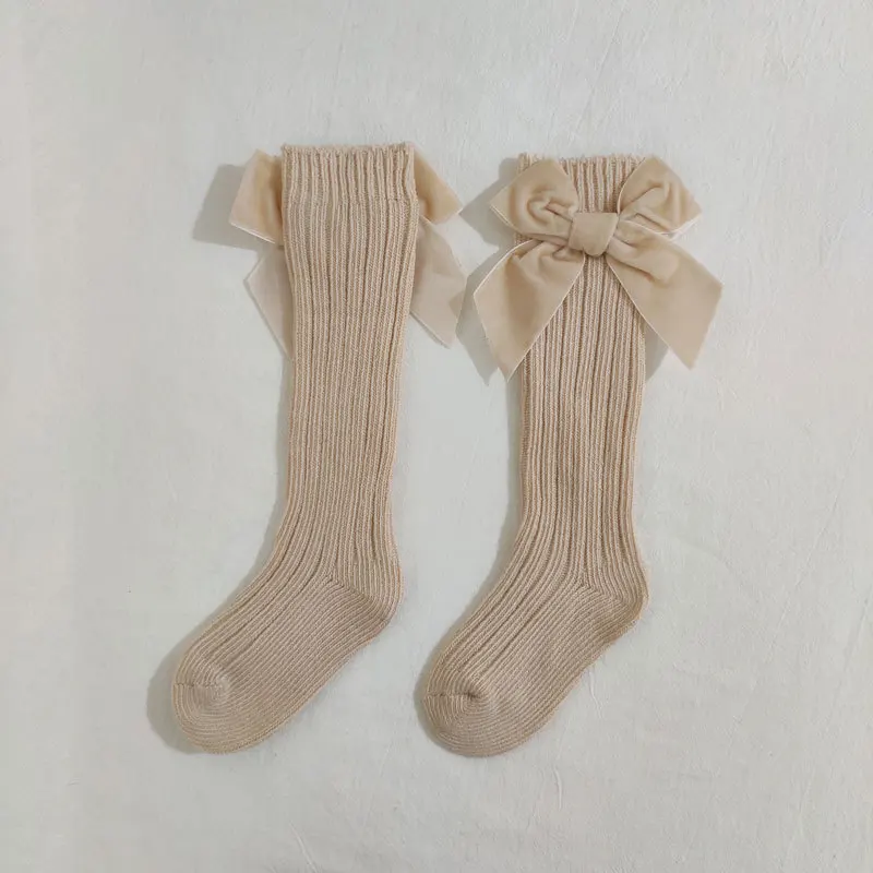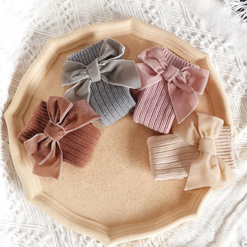 Зимние детские гольфы, Детские хлопковые рождественские носки с большим бантом, однотонные шерстяные гетры для девочек, длинные носки для малышей от 0 до 5 лет