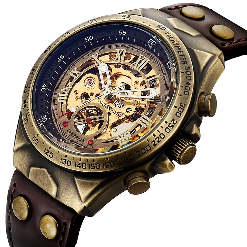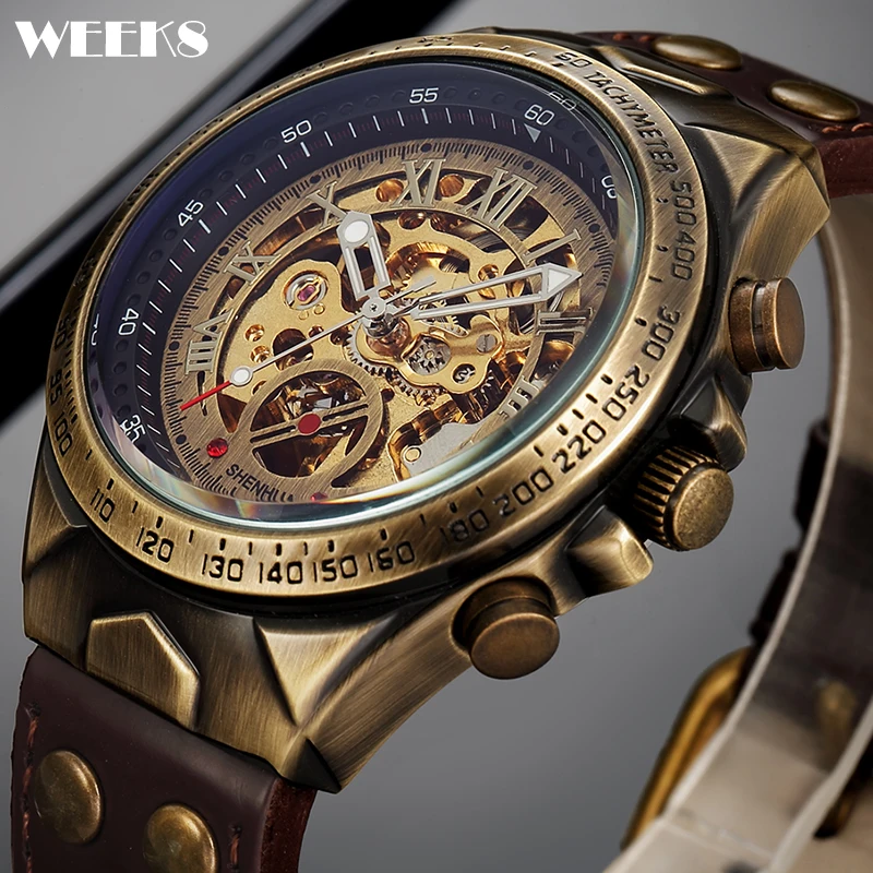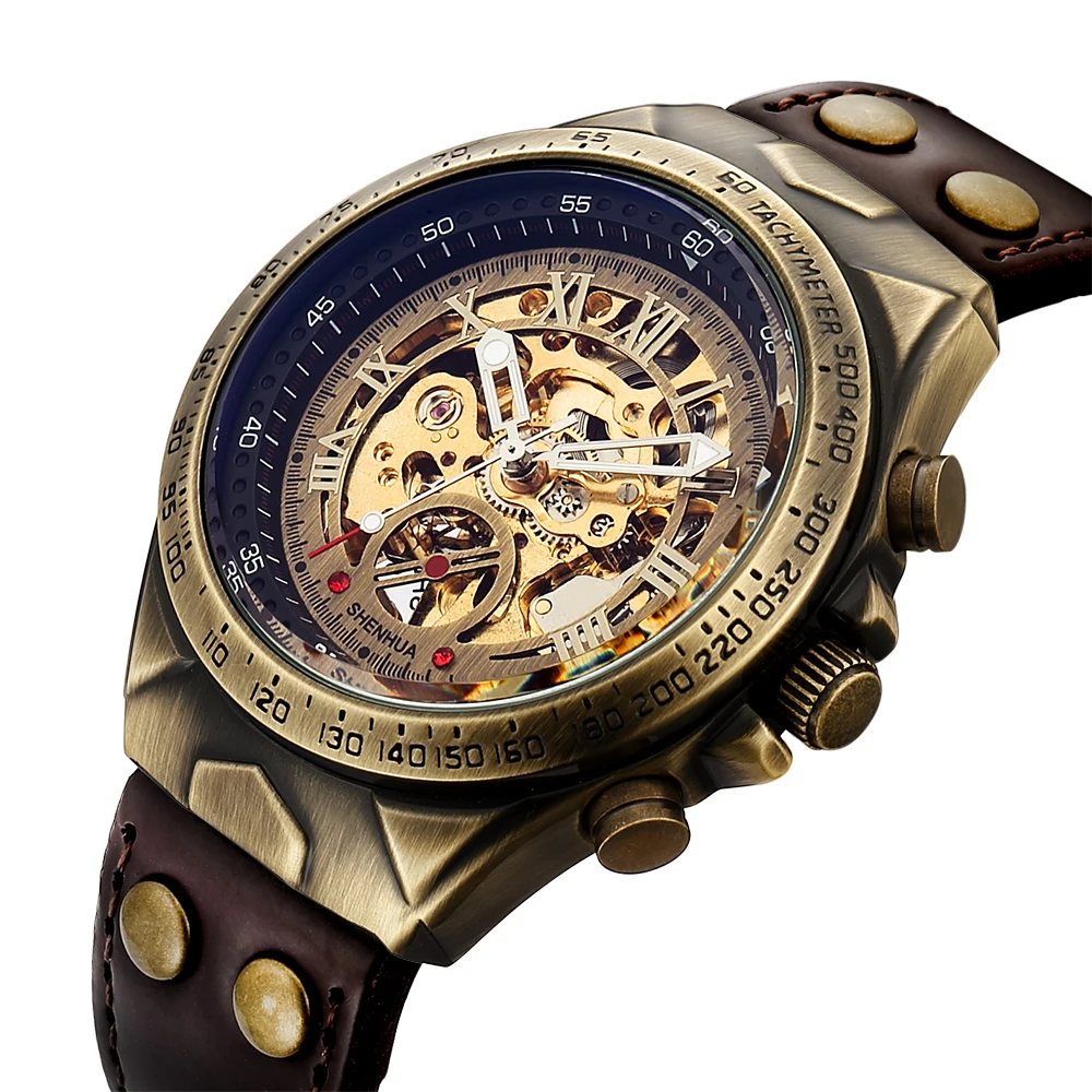 Часы мужские механические с автоподзаводом, винтажные наручные часы-скелетоны в стиле стимпанк, с ремешком из натуральной кожи, бронзовые коричневые