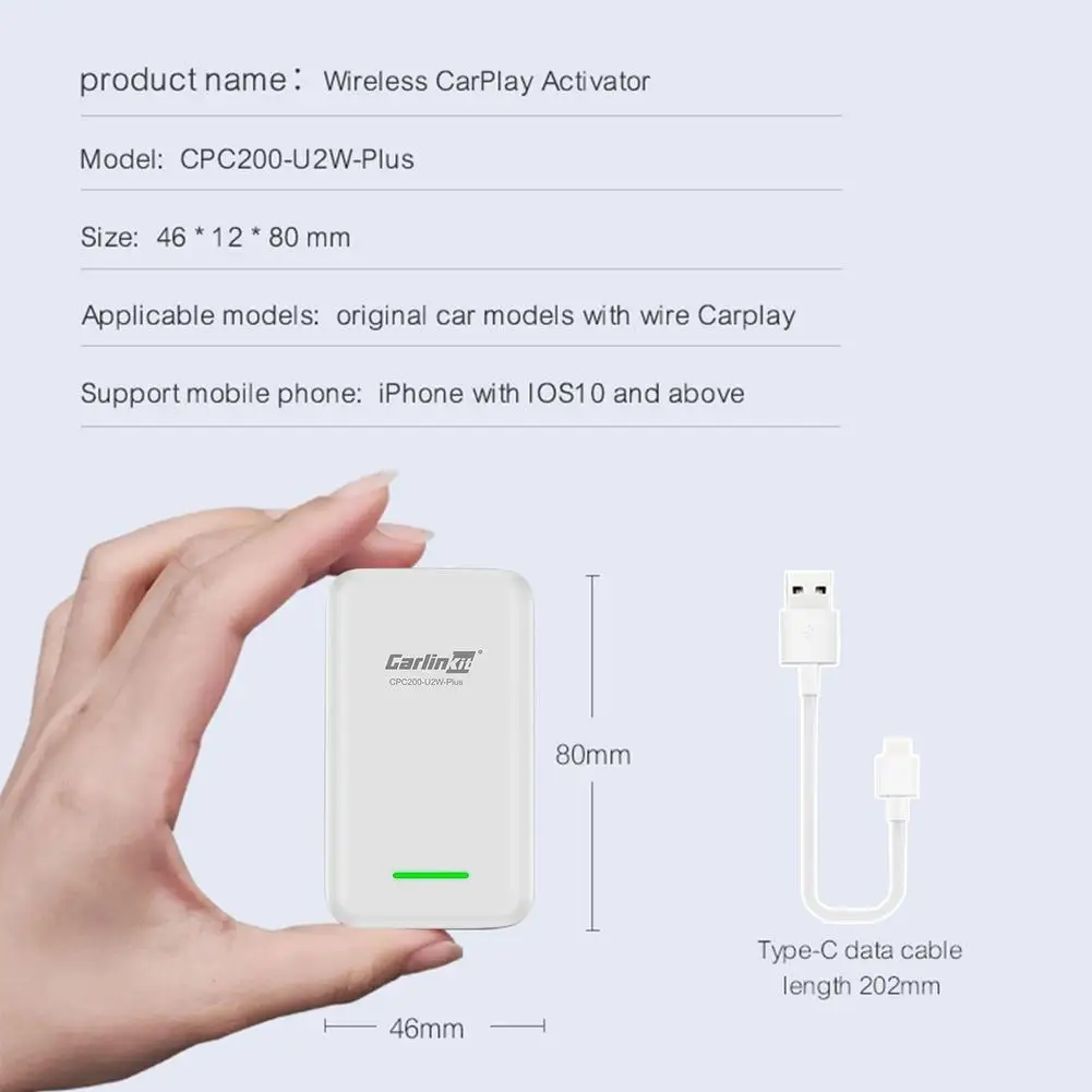 Название: проводной к беспроводному адаптеру CarplayМодель: CPC200-U2W-PlusРазмеры: около 80*26 мм/3,15 * 1.02inВходная мощность: 5 В 1-2.1AВыходная мощность: 5 В 1-2.1AМощность Потребляемая мощность: 0,25 WМетод подключения: беспроводное соединениеАдаптированные модели: оригинальный автомобиль с проводом CarplayПоддержка Мобильный телефон: для iPhone с системой для iOS10 и выше