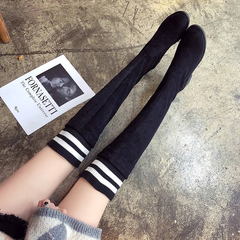 Новинка 2022, длинные ботинки на плоской подошве, плюшевые модные вязаные высокие сапоги до бедра, женские носки в полоску, зимние сапоги на каблуке, ботинки челси