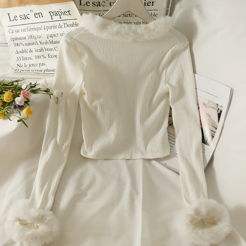 Рубашка с длинным рукавом Y2K, одежда с меховой отделкой, топы с во...
