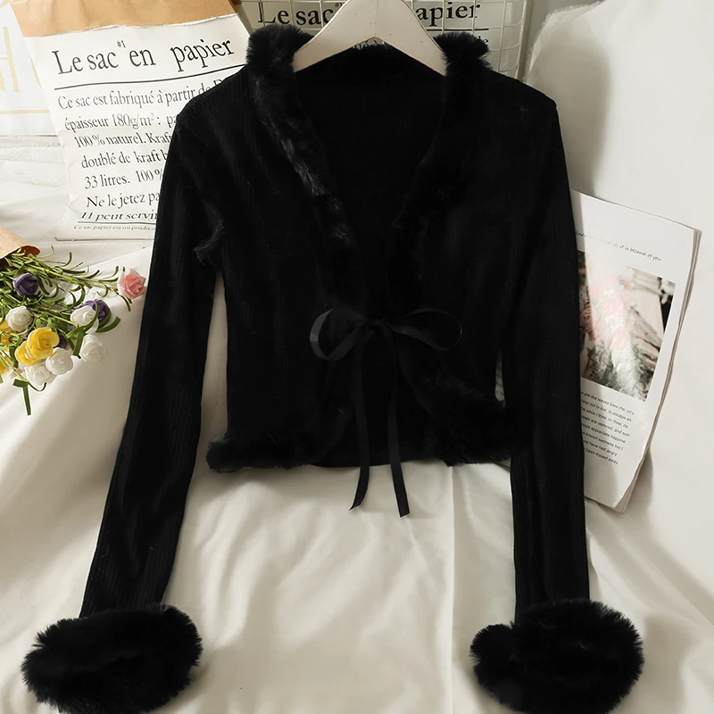 Дешевая оптовая продажа, Новинка весна-осень 2021, модный сексуальный красивый Укороченный кардиган, Женский Повседневный женский кардиган OL с черным мехом, укороченный топ BVt