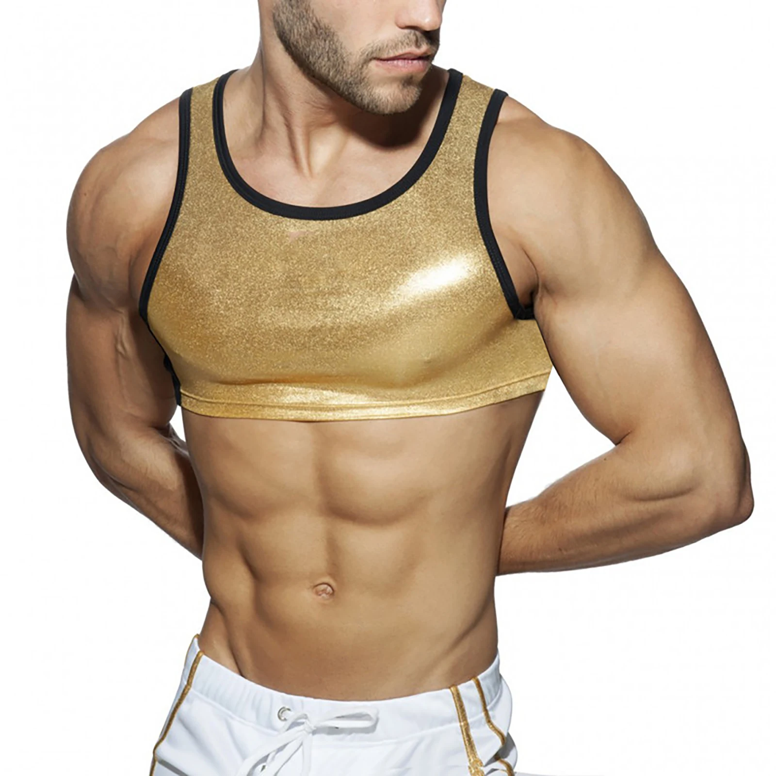 Кроп-топ мужской короткий блестящий, пикантная майка без рукавов, металлик, модная Клубная одежда для ночных вечеринок, облегающая футболка