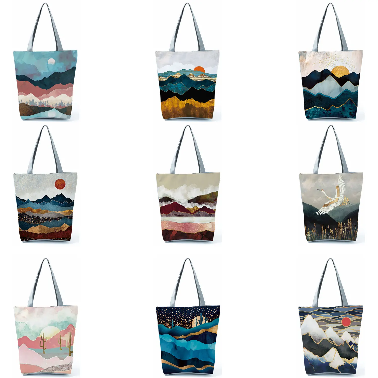 Сумка-тоут женская с принтом масляной живописи, повседневная сумочка-Шоппер для покупок с принтом гор и леса, повседневный пляжный саквояж на плечо для отдыха и путешествий