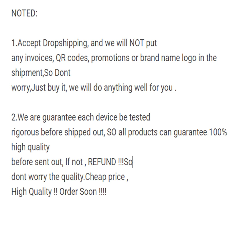 Примечание:1. Принимаем дропшиппинг, и мы не ставимЛюбые счета-фактуры, qr-коды, рекламные акции или логотип бренда в пересылке, так что неВолнуйтесь, просто купите его, мы сделаем все для вас хорошо.2. Мы гарантируем, что каждое устройство будет протестированоСтрогий перед отправкой, так что все продукты могут гарантировать 100% Высокое качествоПеред отправкой, если нет, возврат денег! !Не беспокойтесь о качестве. Дешевая цена,Высокое качество! Закажите скоро!