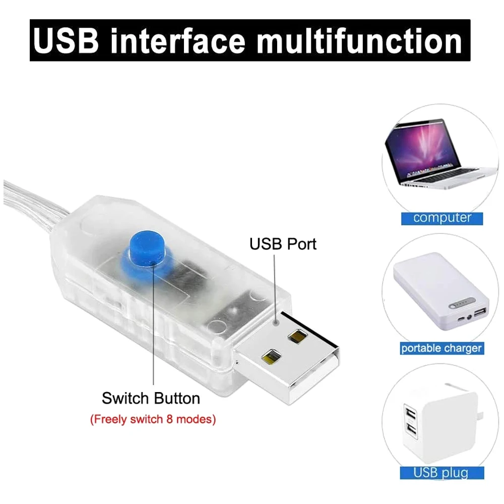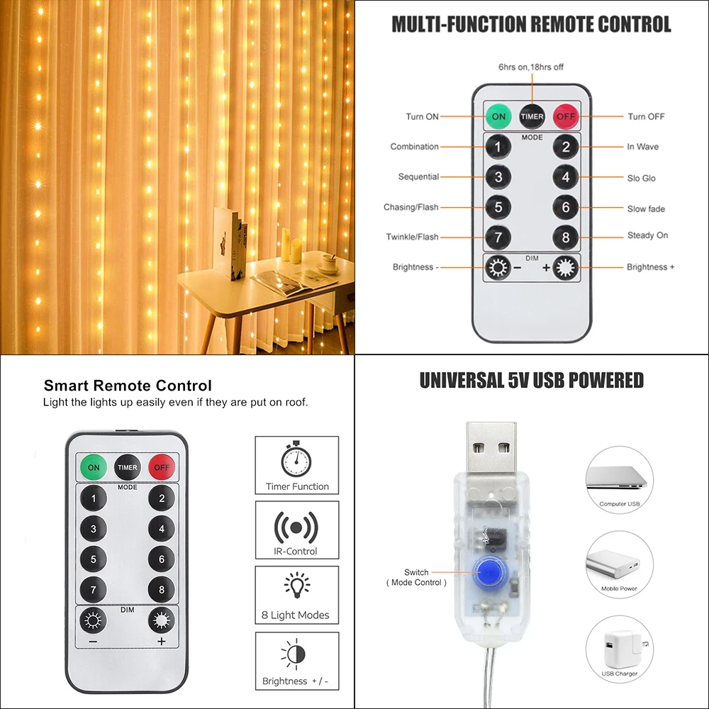 Водонепроницаемость: IP44 Питание от: USB Светильник источник света: светодиодный Светодиодный Количество: 100 / 200 / 300 светодиодный s Светодиодный цвет: теплый белый/многоцветный Срок службы: 50000 часов Переключатель 8 режимов: на USB или пульте дистанционного управления Длина 3 метра, высота 1 м/2 м/3 м на выбор