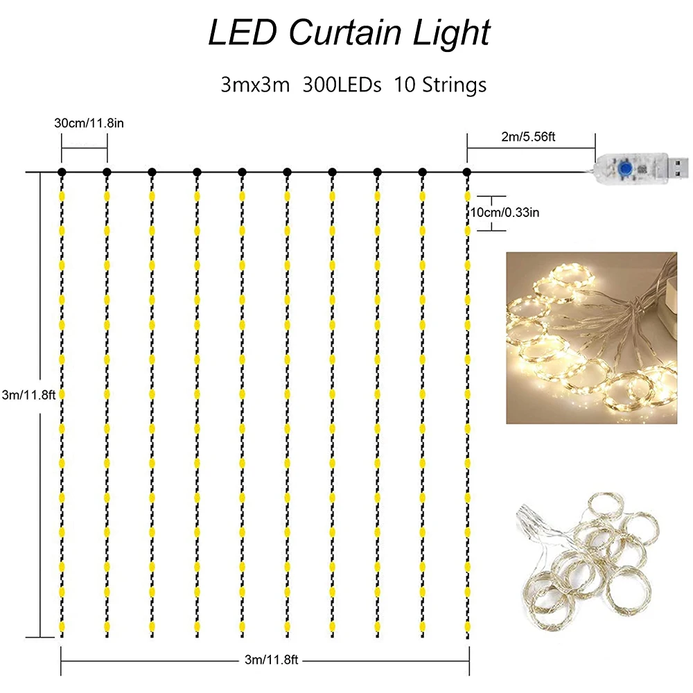 * Высокое качество водонепроницаемости: 300 высокояркое теплое белое светодиодное освещение. Usb-разъем обеспечивает 4,5 V безопасный выход и безопасен для использования. Можно безопасно использовать в помещении и на открытом воздухе. * Функция памяти и таймера: контроллер имеет функцию памяти, которая может быть восстановлена из предыдущего режима настройки после перезапуска-режим таймера (6 часов и 18 часов). * Простота установки и использования: светодиодный светильник для штор имеет десять мини-крючки, которые могут помочь вам легко повесить светильник на занавеску или другие места. * Декоративный шнур лампы: легко повесить на стены, окна, двери, полы, потолки, траву, рождественские деревья и т. Д. Занавески являются идеальным украшением для вечеринок, Рождества, свадеб или любого дома, спальни и других мест, террас и садов.