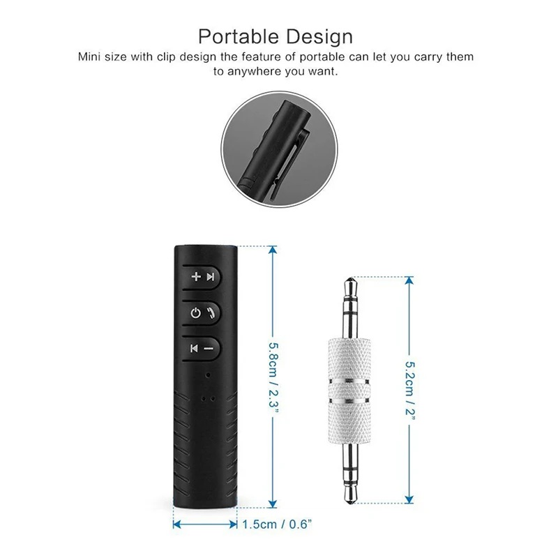 Беспроводная игра: Устранение проблем с проводным подключением, через беспроводное соединение и передачу, пользователь может наслаждаться высококачественной музыкой в любом месте внутри с помощью беспроводного управления.Портативный дизайн: мини-размер с дизайном зажима функция портативности может позволить вам носить их в любом месте вы хотите.Совместим с бытовыми стерео-и акустическими системами/динамик, автомобильными стерео-и акустическими системами наушники, с 3,5 мм аудио вход.Спецификация условий:Тип: bluetooth-аудио приемникМатериал: пластикКоличество: 1 шт.Цвет изделия: черныйВерсия Bluetooth: 4,1Профиль: A2DPДиапазон передачи: до 10 м/33 футовI / O 3,5 мм гнездовой разъем, мини-флеш-накопитель USB с гнездовым портИсточник питания: 5 В постоянного токаВремя зарядки: около 30 минВремя работы: около 4 чРазмер: 1,4*1,5*5,8 см/0,5*0,6*2,3 "(Д * Ш * В)Посылка:1 * Аудио приемник Bluetooth1*3,5 мм до 3,5 мм адаптер1 * Руководство пользователя на английском языке