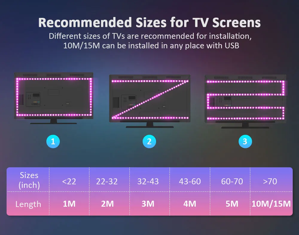 Для установки рекомендуется использовать разные размеры телевизоров, 10/15 м можно устанавливать в любом месте с помощью USB.