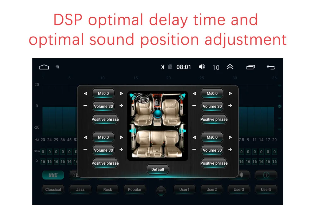 Вы можете выбрать пользовательский, Стандартный, рок, мягкий, классический, поп, зал, джаз, кино, его поддержку для регулировки SUBW,LOW,MID, высокий, и вы можете установить звук на драйвер, переднее, заднее все положение