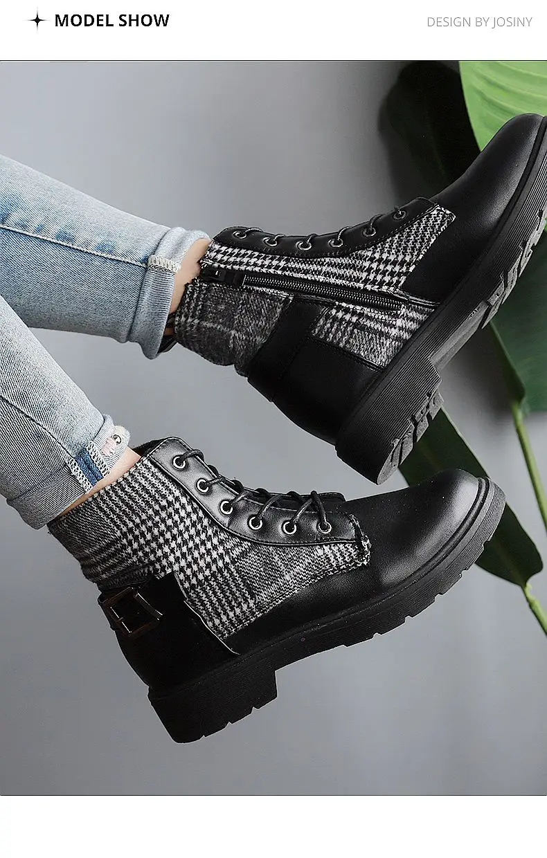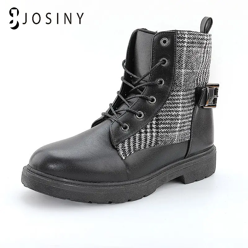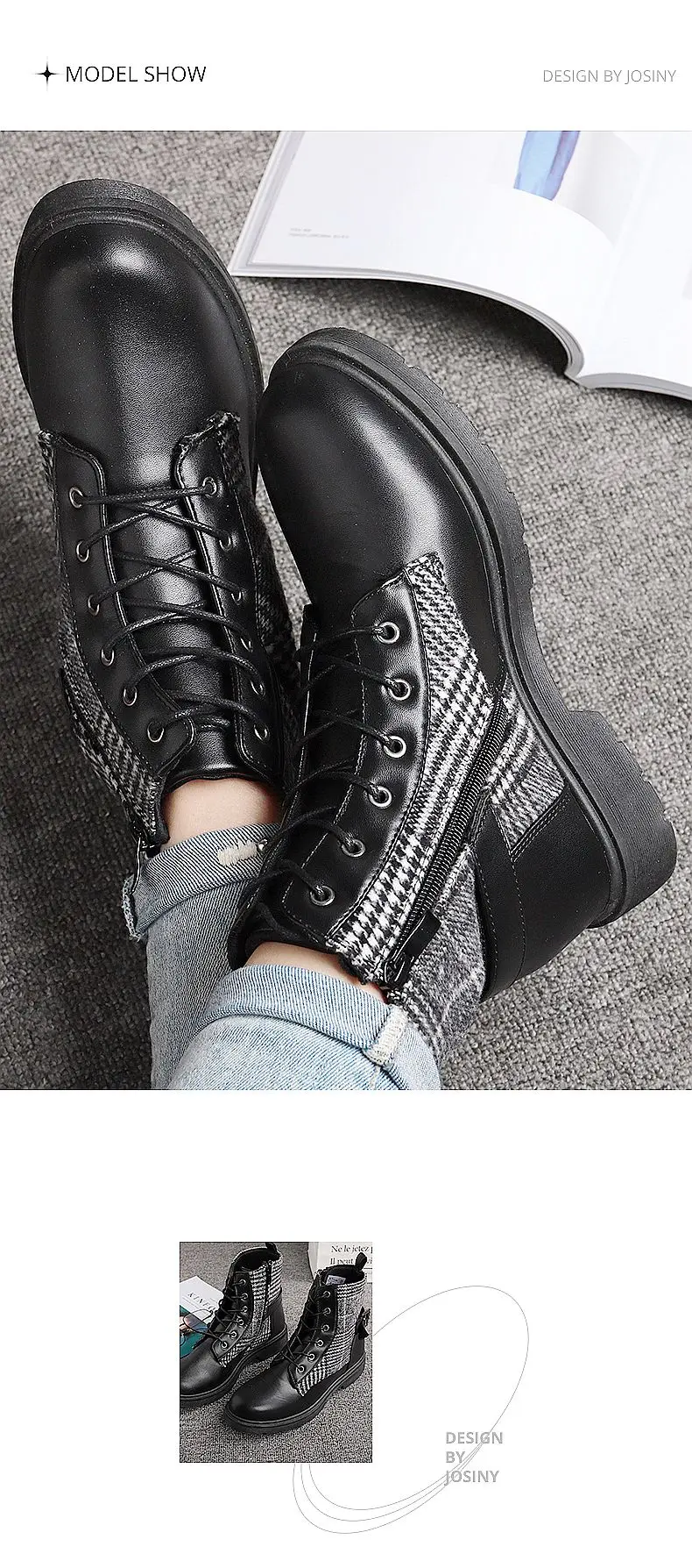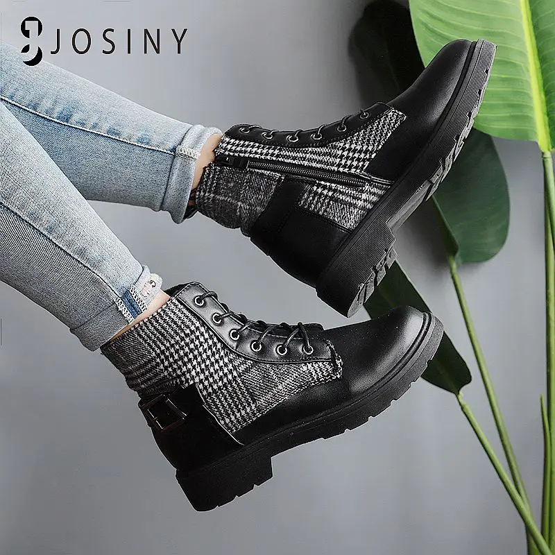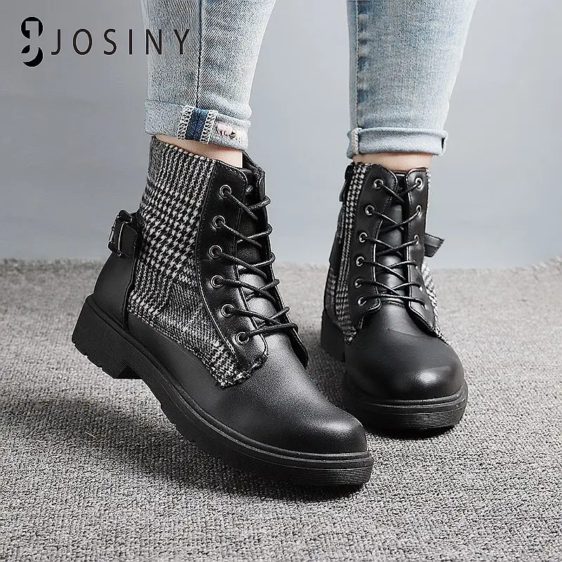 Женские зимние ботинки JOSINY, женские ботильоны в клетку из искусственной кожи, черные ботинки с круглым носком, женская обувь на платформе и каблуке
