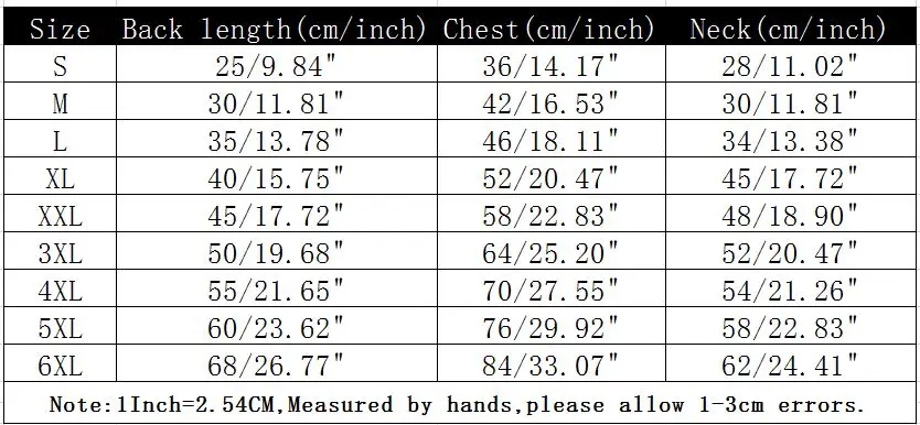 Как измерить размер собаки? Грудь: Измерьте самую толстую часть груди, добавьте 1-2 см. (Обычно требуется два lwgs) Длина: Убедитесь, что ваша собака Стоит правильно, не сидя и не лежа. Измерьте вдоль позвоночника собаки от основания шеи до 5 см передней части основания хвоста. Горловина: обхват шеи, размер 2-3 см будет лучше. Номер: Если у вашей собаки большая грудь, длинные волосы или Высокий конец размера, вы можете заказать следующий больший размер, чтобы обеспечить удобную посадку. Информация о размерах: Размер S для тела 25 см (9,84 дюйма), обхват груди 36 см (14,17 дюйма), шея 28 см (11,02 дюйма) Размер M для тела 30 см (11,81 дюйма), грудь 42 см (16,54 дюйма), Шея 30 см (11,81 дюйма) Размер L для тела 35 см (13,78 дюйма), грудь 46 см (18,11 дюйма), шея 34 см (13,38 дюйма) Размер XL для тела 40 см (15,75 дюйма), грудь 52 см (20,47 дюйма), шея 45 см (17,72 дюйма) размер XXL для тела 45 см (17,72 дюйма), грудь 58 см (22,83 дюйма), шея 48 см (18,90 дюйма) Размер 3XL для тела 50 см (19,68 дюйма), грудь 64 см (25,20 дюйма), шея 50 см (20,47 дюйма) Размер 4XL для тела 55 см (21,65 дюйма), грудь 70 см (29,92 дюйма), шея 54 см (21,26 дюйма) Размеры 5XL для тела 60 см (23,62 дюймов), обхват груди 76 см (12,6 дюйма), горловины 58 см (22,83 дюймов) Размеры 6XL для тела 68 см (26,77 дюймов) грудь 84 см (33,07 дюйма), шея 62 см (24,41 дюйма)