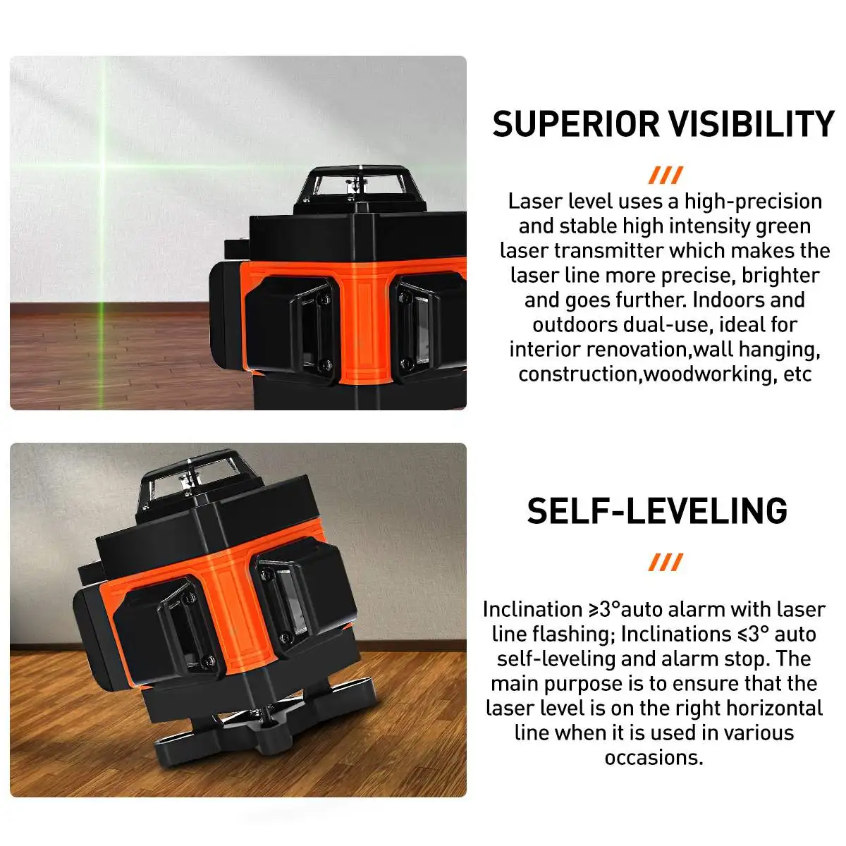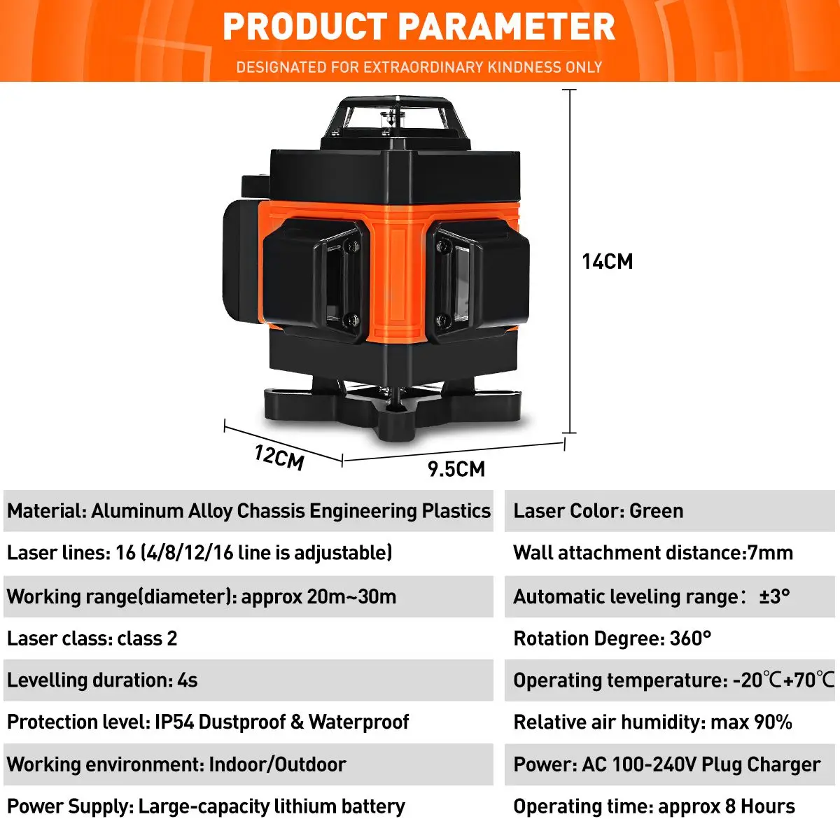 16-линейный 4D лазерный уровень с зелеными линиями, Сверхмощный лазерный уровень с горизонтальными и вертикальными линиями для селфи, лазерный уровень с зеленым лучом 360
