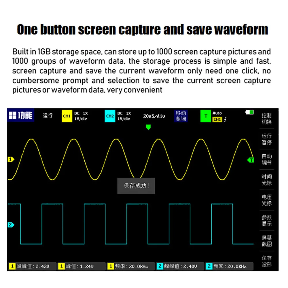 Описание:Встроенный генератор сигналов DDS, поддержка 12 видов функционального сигнала.Промышленный оригинальный выходной сигнал позволяет хранить до 1000 сигналов захвата.Целевой Высокоинтеллектуальный алгоритм декодирования, срок службы кодировщика бесконечен.Интеллектуальная защита от ожогов,1X Выдерживает напряжение до 400 В.100 МГц аналоговая полоса пропускания @ 1GSa/s частота дискретизации(1X = 5 МГц,10X = 100 МГц).Характеристики:ТоварНазвание: ОсциллографЦвет: белыйВилка: ЕС/СШААналоговая полоса пропускания: 100 МГц x 2Количество каналов: 2 каналаМаксимальная частота дискретизации в реальном времени: 1GSa/sВертикальная чувствительность: 50 мВ/див ~ 500 В/ДивГоризонтальный диапазон времени: 50S/div ~ 10NS/divМаксимальное тестовое напряжение: 40 В (1X зонд), 400 В (10X зонд)Глубина хранения: 240 кбитВходное сопротивление: 1 МОмТочность ADC: 8 битРежим соединения: AC/DCРежим запуска: одиночный, нормальный, автоматическийКромка триггера: поднимающаяся кромка/опускающаяся кромкаВнешнее триггерное напряжение 0-40 вДисплей: 7 дюймов-800*480Удлинительные порты: экспорт изображений USBРазмер: 340 мм x 140 мм x 70 ммВес: 1,5 кгПримечание:-Возможны небольшие погрешности в размере при ручном измерении.-Отклонение цвета может отличаться из-за различных настроек монитора, пожалуйста, поймите.Упаковочный лист