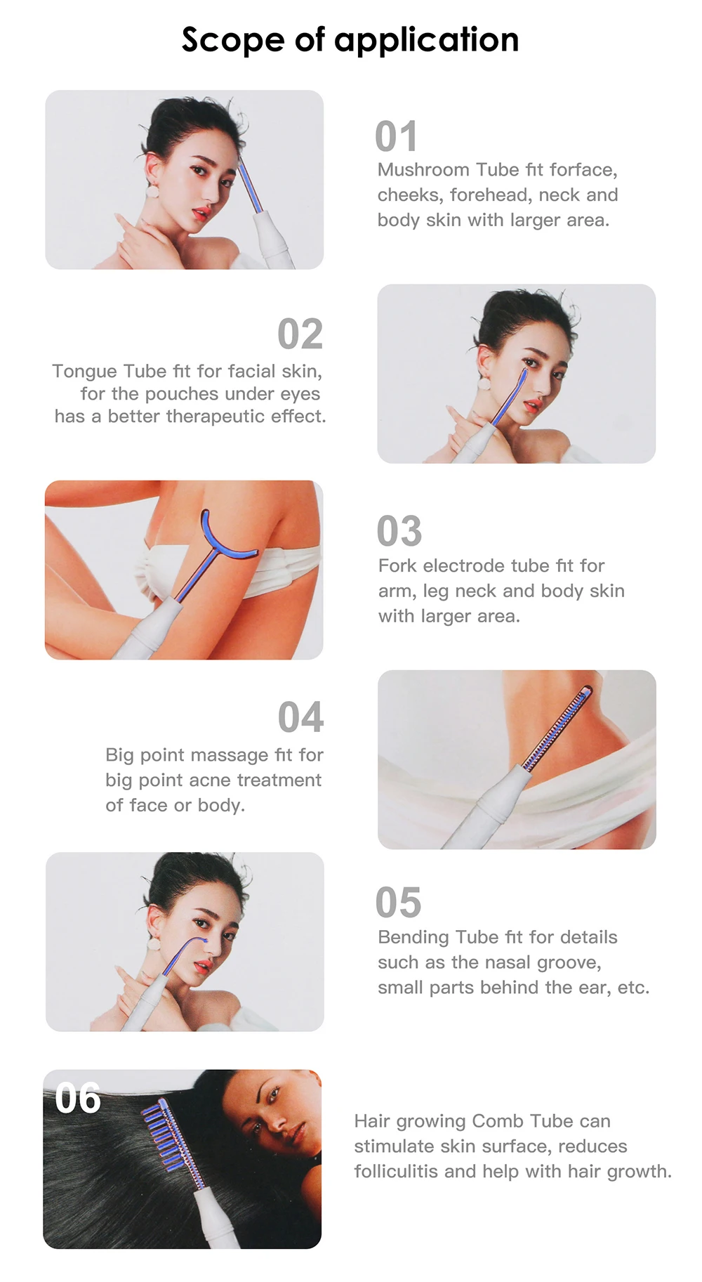Палочка для языка: лечение акне и прыщей. Это может значительно уменьшить их внешний вид и тяжесть, естественно и безболезненно убивая бактерии внутри.Палочка для удочек: подходит для использования на теле. Лоб и другие более широкие области с наддувом из вольфрамаИзогнутая палочка: используется для прыщей и других дефектов кожи. Идеально подходит для небольших областей, таких как складки вокруг носа, губ и т. д.Грибная палочка: лечит щеки, лоб и морщины. Используйте это в сочетании с предварительно нанесенными сыворотками и кремами для увеличения их впитывания в кожуY-образная палочка: используется для шеи, рук, ног или других областей, которые могут быть вставлены между ними.Гребень палочка: активирует волосяные фолликулы и способствует циркуляции крови. Это может уменьшить выпадение волос, уменьшая сухость и перхоти.