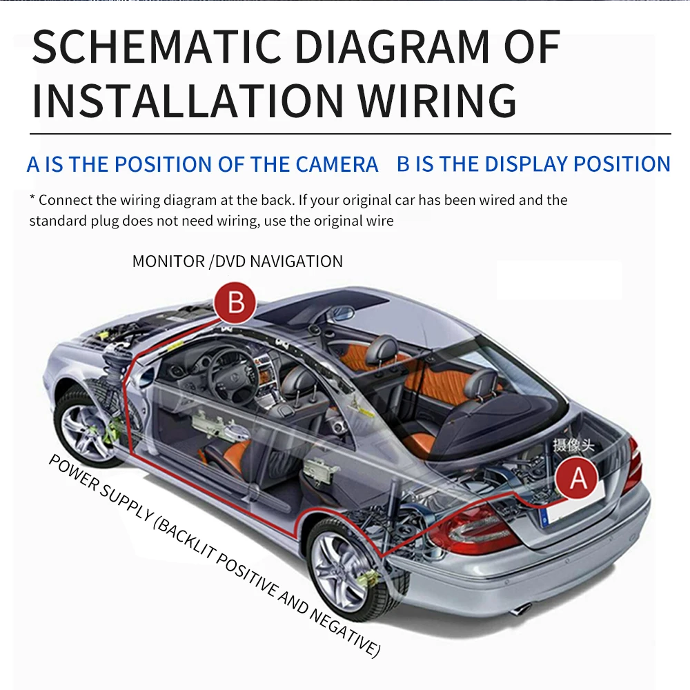 *** Примечание: Если монитор android dvd или стерео радио, вам нужен кабель 6 м красный триггер провода A и B:Соединительный обратный светильник мощностью DC12V +.B Подключите к проводу запуска DVD.