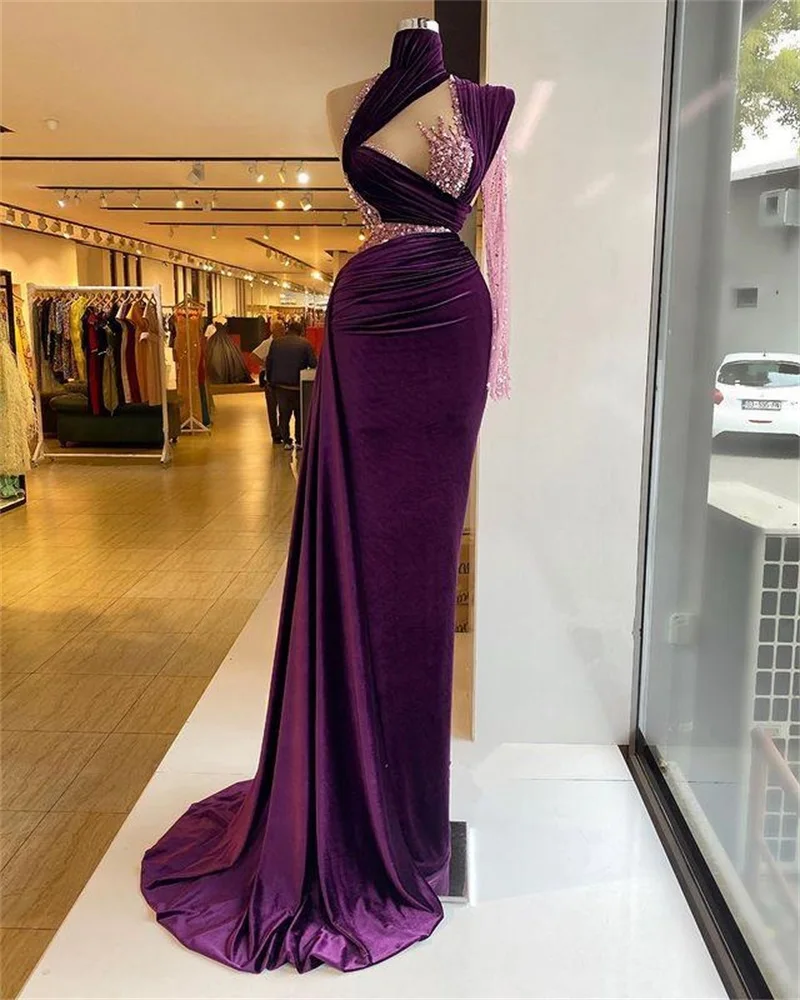 Фиолетовые бархатные сексуальные платья для выпускного вечера, вышитое бисером