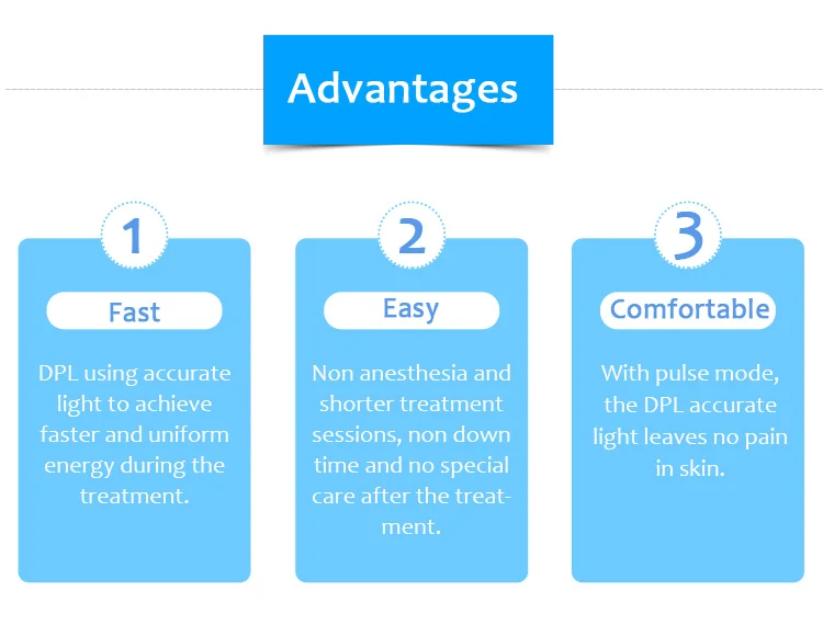 DPL использует точный светильник для достижения более быстрой и равномерной энергии во время обработкиБез анестезии и более короткие сеансы лечения. Без времени простоя и без особой заботы после лечения.При импульсном режиме точный светильник DPL не оставляет боли в коже.