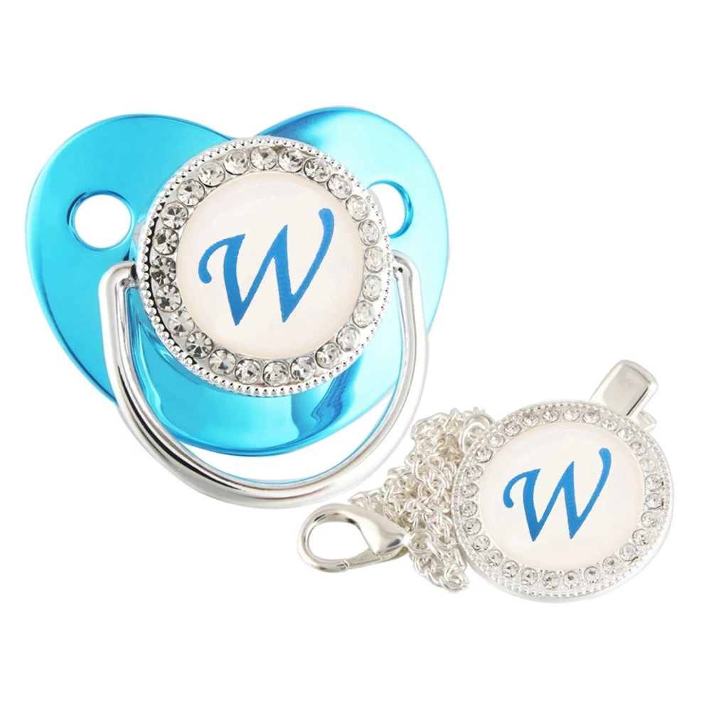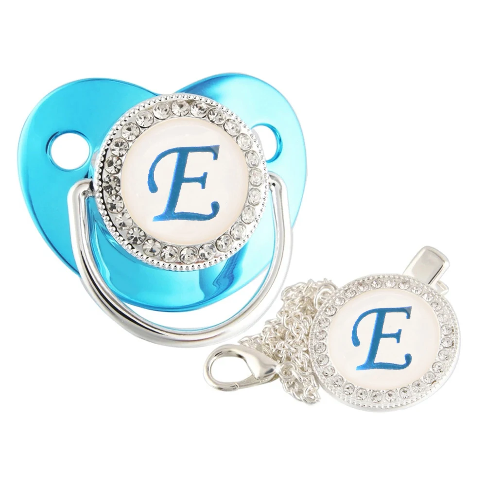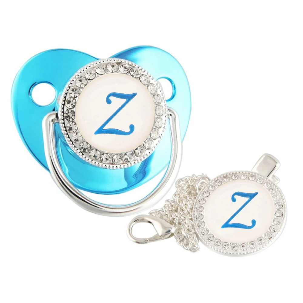 Роскошные название 26 с инициалами насквозь детская пустышка на цепочке с прищепкой детская пустышка на цепочке с BPA бесплатные силиконовые детские соски-пустышки Bling Металлический Синий Детская пустышка на цепочке с прищепкой