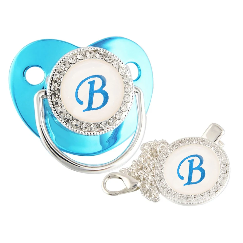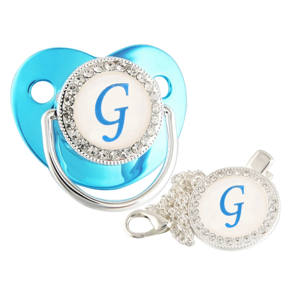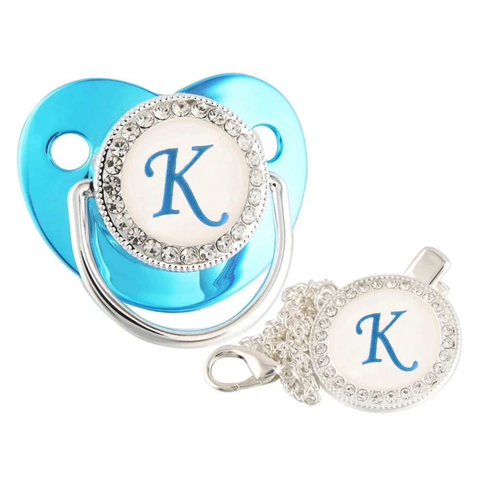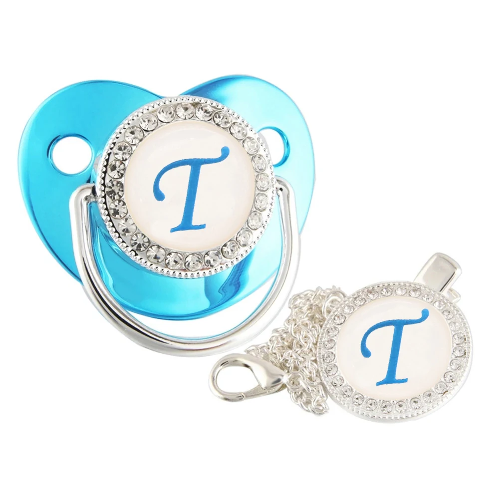 Роскошные название 26 с инициалами насквозь детская пустышка на цепочке с прищепкой детская пустышка на цепочке с BPA бесплатные силиконовые детские соски-пустышки Bling Металлический Синий Детская пустышка на цепочке с прищепкой
