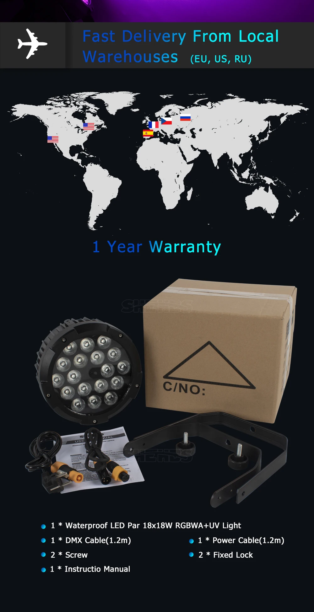 * Светодиодный источник:Светодиодный 18 × 18 Вт RGBWA + UV6in1 красный, зеленый, синий, белый, янтарный, ультрафиолетовый и смешанный цвет