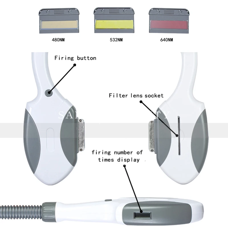 Эта машина оснащена тремя фильтрами:640 мм, 530 мм, 480 мм640 мм: для удаления волос530 мм: для омоложения кожи пигментная терапия и удаление морщин480 мм: для сосудистой терапии и лечения акне