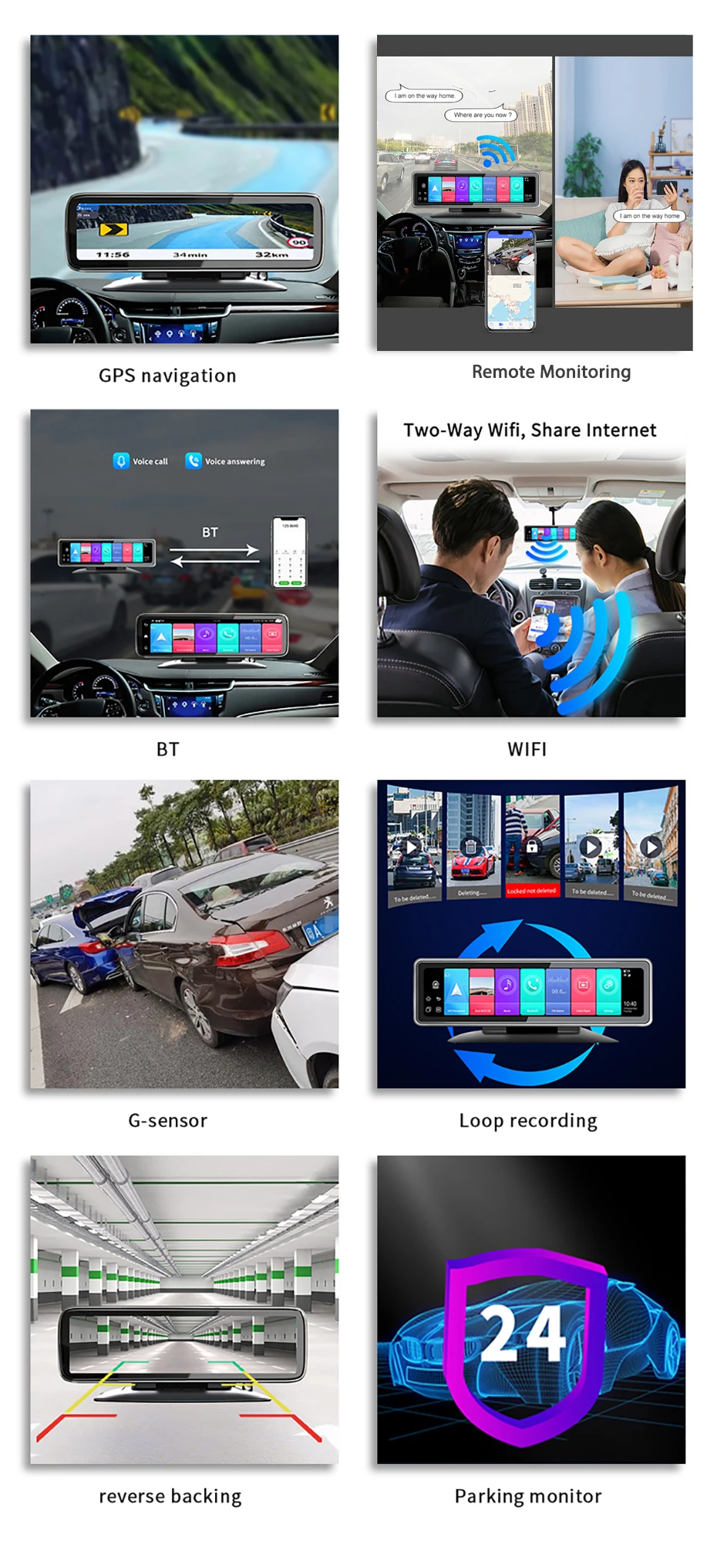 1. 12 дюймовый сенсорный экран2. 4 камеры записи одновременно (передняя + задняя + правая + левая камера записи), ночное видение3. Угол обзора 360 градусов4. android 9,0 2 + 32G для хранения5. Поддержка gps-навигации6. Встроен в google play market7. Поддержка функции fm-передатчика8. Прямой WIFI и функция BT9. 24H монитор парковки10. Поддержка Интернет-диапазонов 4G, как показано ниже:2G GSM B5/B3/B8;3G WCDMA B1/B5/B8;4G TDD-LTE B38/B39/B40/B41;4G FDD-LTE B1/B3/B5/B811. Функция мобильного удаленного монитора12. Поддержка внутренней связи13. Поддержка потокового видео в режиме реального времени на телефоне14. Поддержка воспроизведения истории отслеживания GPS15. Платформа для отслеживания cmsv616. Запись видео и изображений через приложение17. Название приложения: автопомощь18. Поддержка двух способов установки* Основание центральной консоли* Специальное крепление для замены оригинального зеркала
