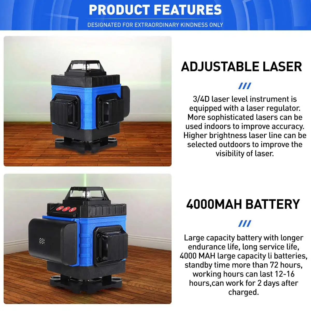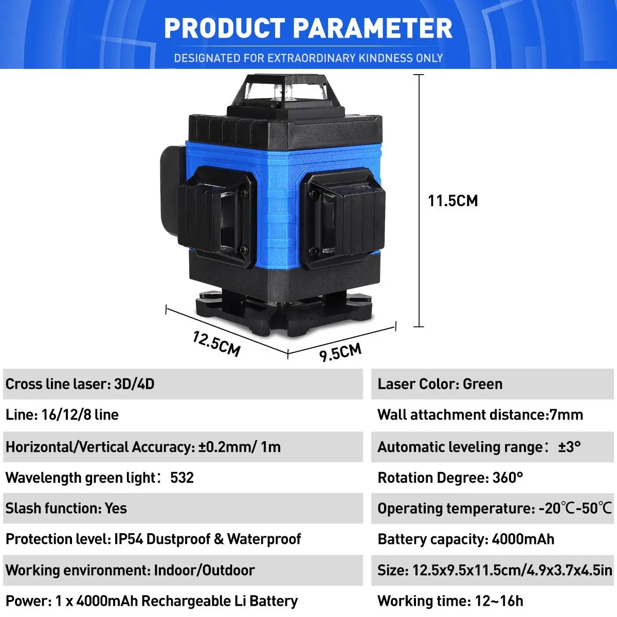 16 линий 360 ° Горизонтальный Вертикальный крест 4D зеленый светильник лазерный уровень самонивелирующийся супер мощный лазерный луч