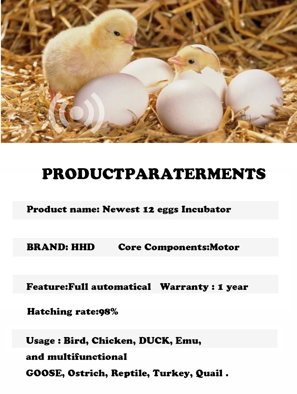 Название продукта: Новый дизайн 12 яиц инкубаторБренд: HHDОсновные компоненты: двигательГарантия: 1 годСкорость вылупления: 98%Характеристика: полностью автоматическийИспользование: птица, курица, утка, эму,И многофункциональныйГусь, Страус, рептилия, Турция, перепела.