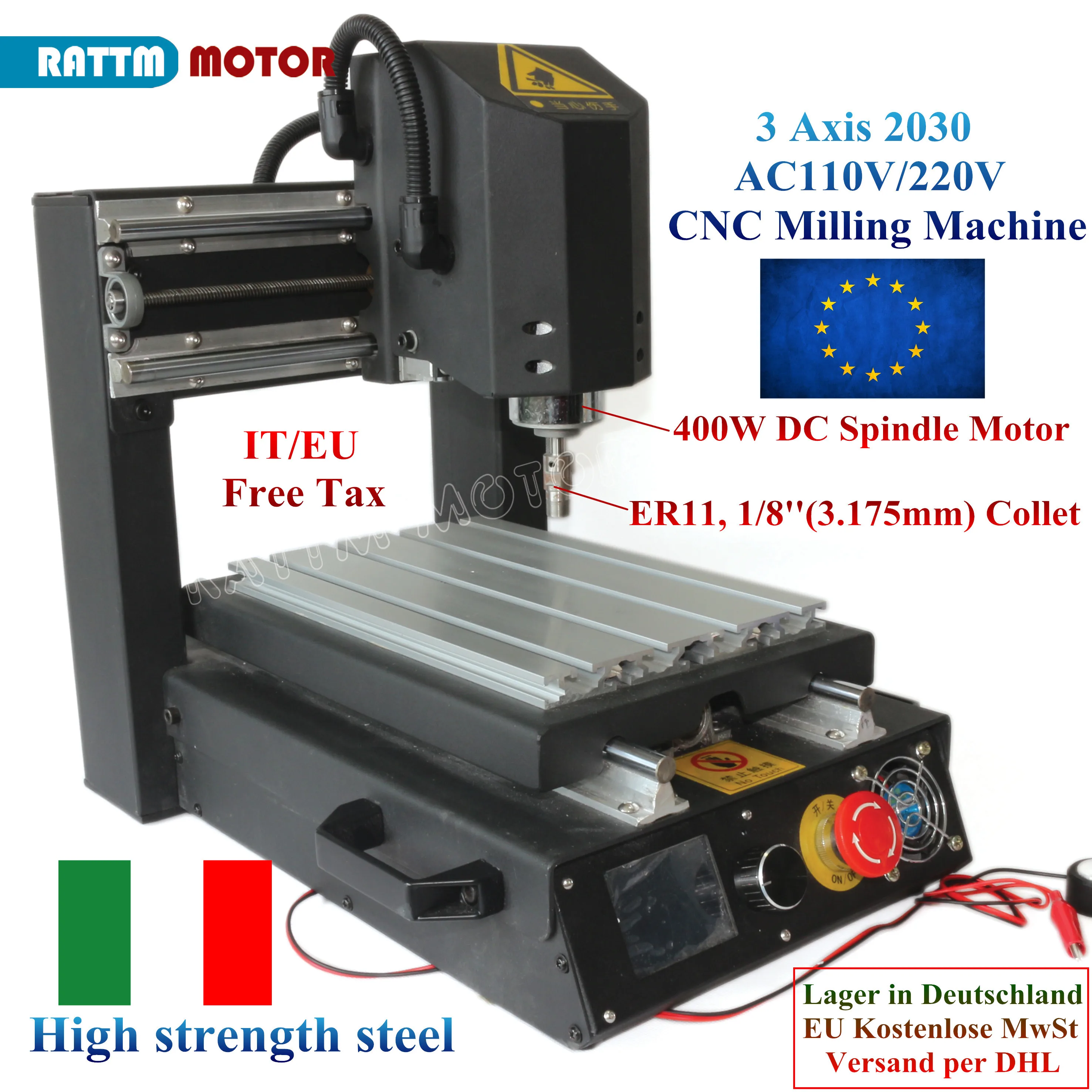 Высокопрочная сталь, 3 оси, 2030 ER11, Настольный фрезерный станок с ЧПУ, Гравировальный фрезерный станок, 110 В220 В + 400 Вт, Шпиндельный двигатель постоянного тока