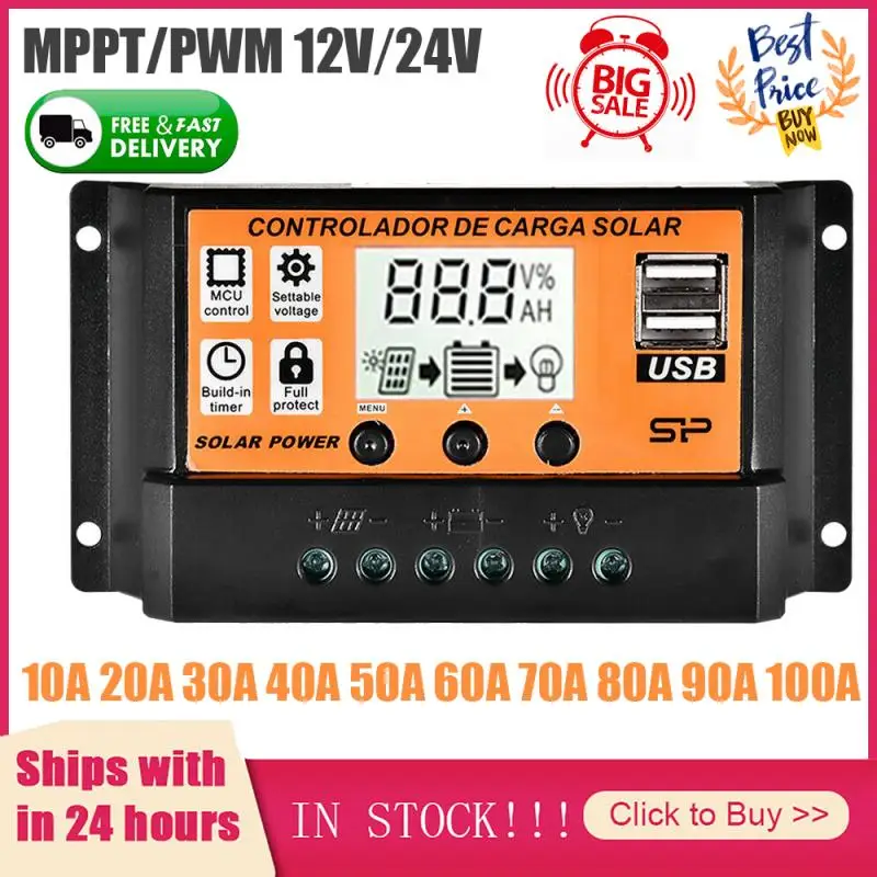 Солнечный контроллер, 12 В24 В, 60 А, 50 А, 40 А, 30 А, 20 А, 10 А, солнечный регулятор, ШИМ-зарядное устройство, ЖК-дисплей, двойной USB 5 В2 А, выход, домашний инструмент