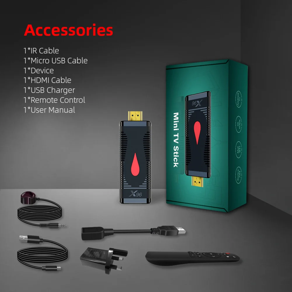 Посылка включает в себя: 1 * ИК-кабель 1 * кабель Micro USB 1 * ТВ-палка 1 * HDMI кабель 1 * Зарядное устройство USB 1 * пульт дистанционного управления 1 * Руководство пользователя