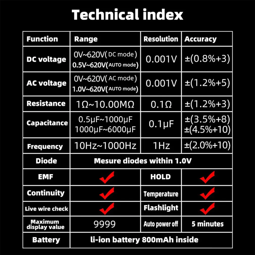 Напряжение переменного тока: 0-620 В ±(0.5% + 5); Разрешение: 0,001 в.