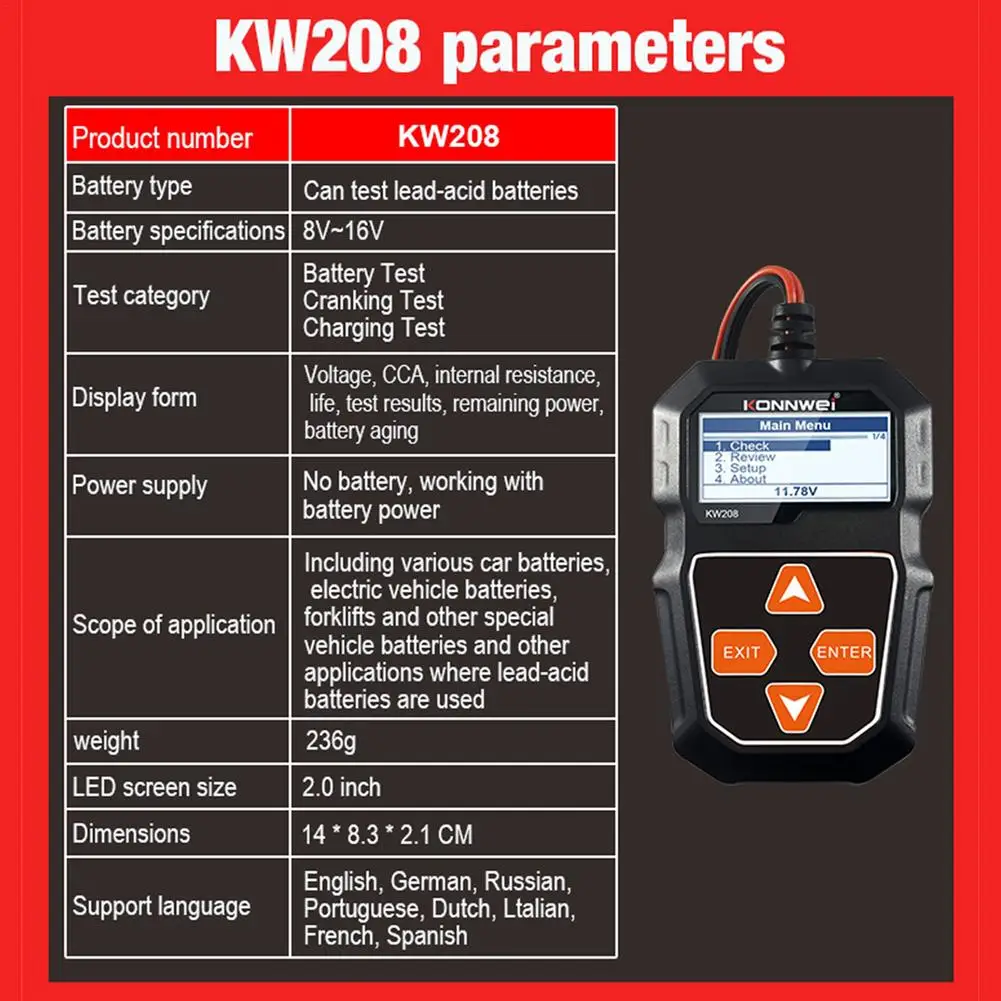 Цифровой анализатор заряда батареи KW208, тестер 12 В для защиты от перенапряжения аккумуляторов, 8 языков