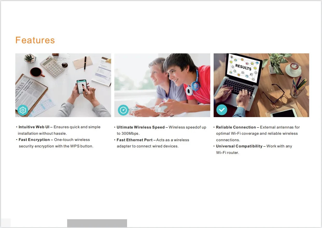 Сильный сигнал и широкий охват С существующим беспроводным маршрутизатором в доме, очень просто реализовать беспроводной мост и реле, и расширить беспроводное покрытие во всех направлениях. 300 м Скорость беспроводного расширения, повышение уровня сигнала, устранение покрытия слепых пятен, дуплекс, Вилла. Wi-Fi без беспокойства, вся семья любит чудесное соединение. Высокая стабильность и защита от помех 11BGN 2,4 GHz band 300Mpbs, небольшие помехи, многоканальный выбор, можно эффективно избежать помех, более стабильная передача Высокоскоростная Беспроводная передача данных 300 Мбит/с Высокоскоростной Wi-Fi 300 м, чтобы наслаждаться беспроводной жизнью С использованием технологии 802.11n 2*2 MIMO multi-receive и multi-передачи Скорость беспроводного подключения составляет до 300 Мбит/с *, что может удовлетворить ваш ежедневный спрос на доступ в Интернет. . Интуитивно понятный веб Ul-обеспечивает быструю и простую установку без хлопот. . Быстрое шифрование-одно касание беспроводного шифрования безопасности с помощью кнопки WPS. . Максимальная Беспроводная скорость-Беспроводная скорость до 300 Мбит/с. . Порт Fast Ethernet-выступает в качестве беспроводного адаптера для подключения проводных устройств. . Надежное подключение-внешние антенны для оптимального покрытия Wi-Fi и надежного беспроводного подключения.. Универсальная совместимость-работает с роутером anyWi-Fi.